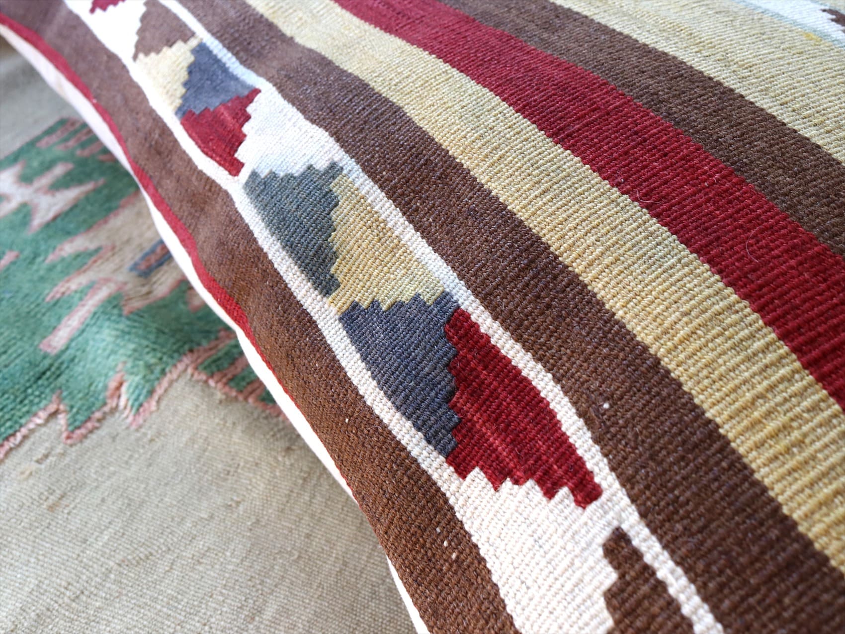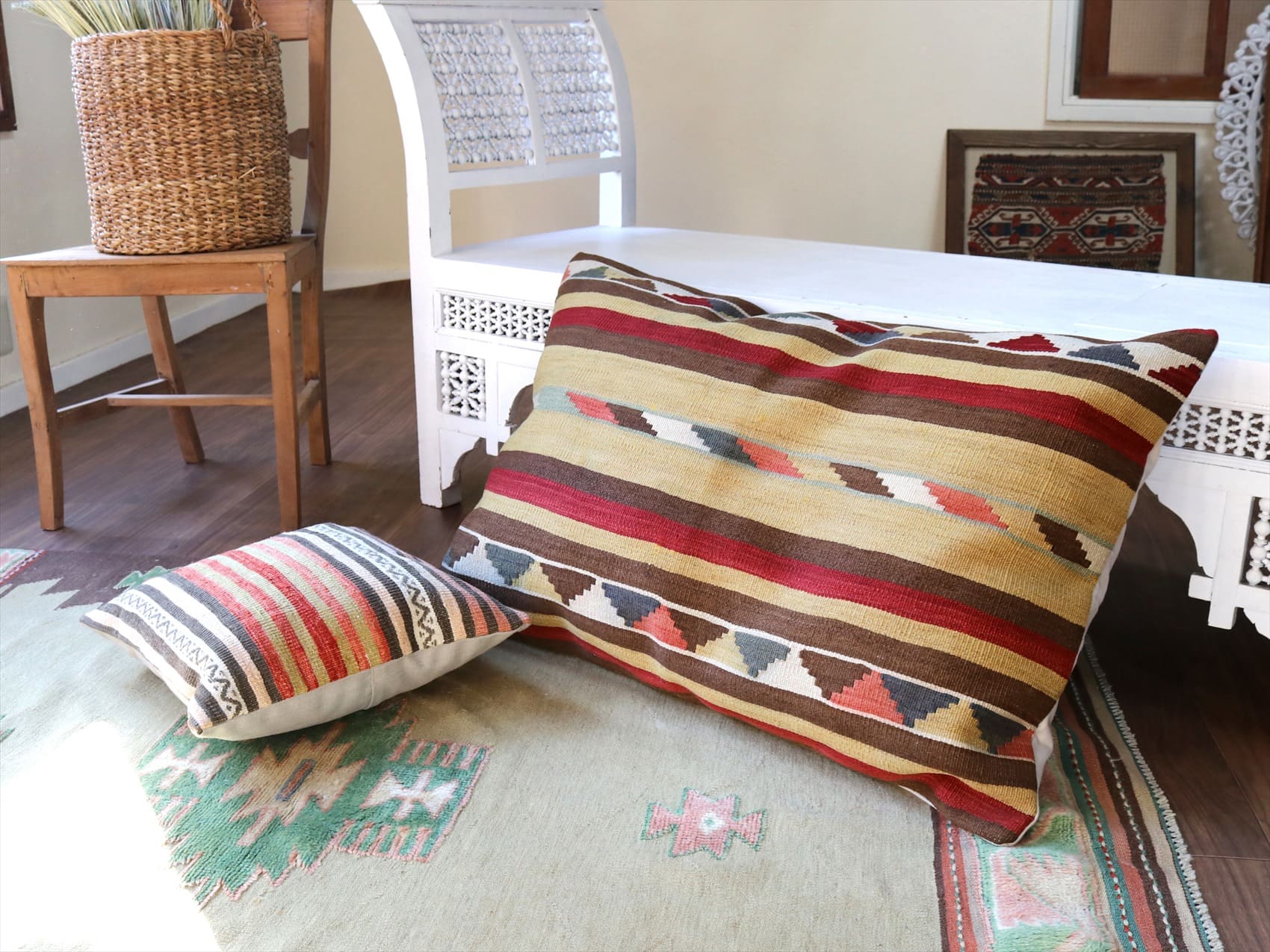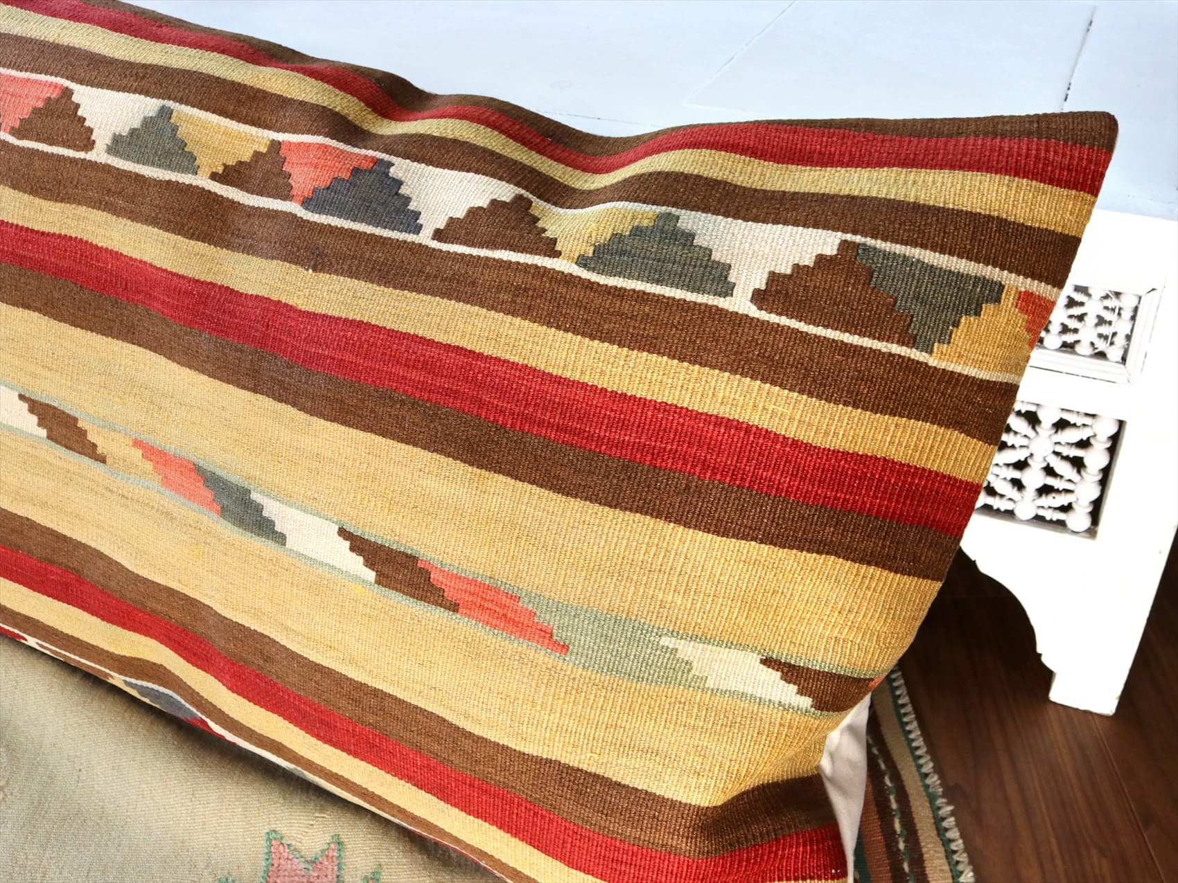 アゼルバイジャン・シルヴァン地方のキリムを使ったクッションカバー。アースカラーの落ち着いたきれいな色合いです。大きなサイズで存在感がありますけれども、シンプルなデザインなのでお部屋に取り入れやすいと思います。