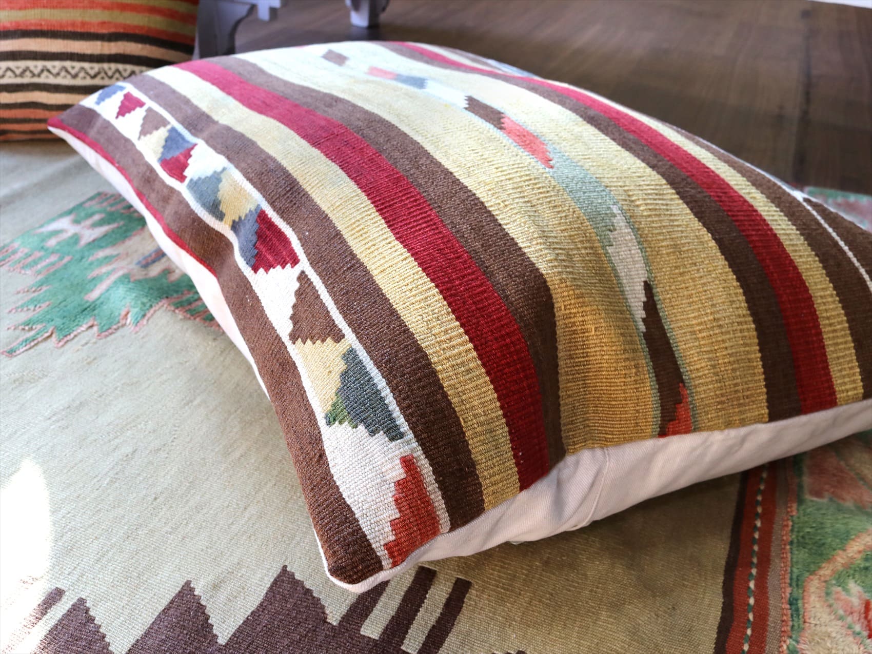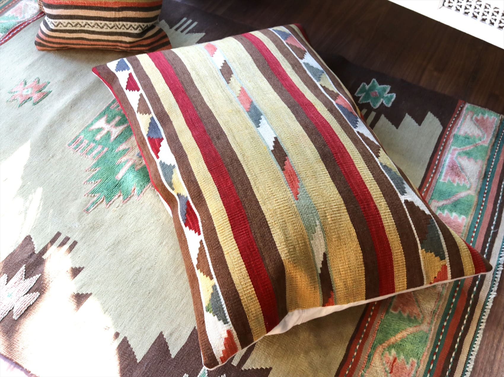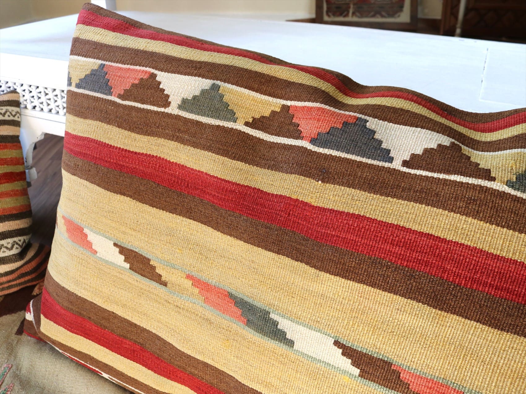 アゼルバイジャン・シルヴァン地方のキリムを使ったクッションカバー。アースカラーの落ち着いたきれいな色合いです。大きなサイズで存在感がありますけれども、シンプルなデザインなのでお部屋に取り入れやすいと思います。