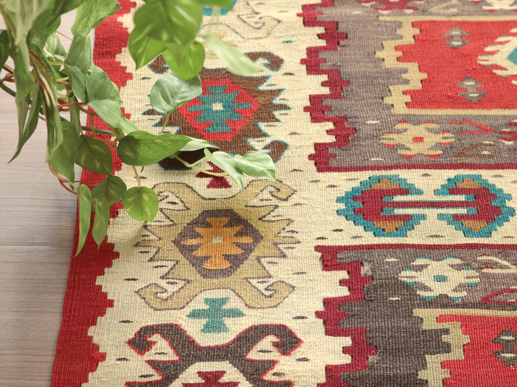 織り目はとても細かく、薄手のキリムです。小さな修理のあとが数か所ありますが、丁寧に処理されていて目立たないようになっています。ところどころ色がにじんでベースのアイボリー色に移ってしまっているところがあります。