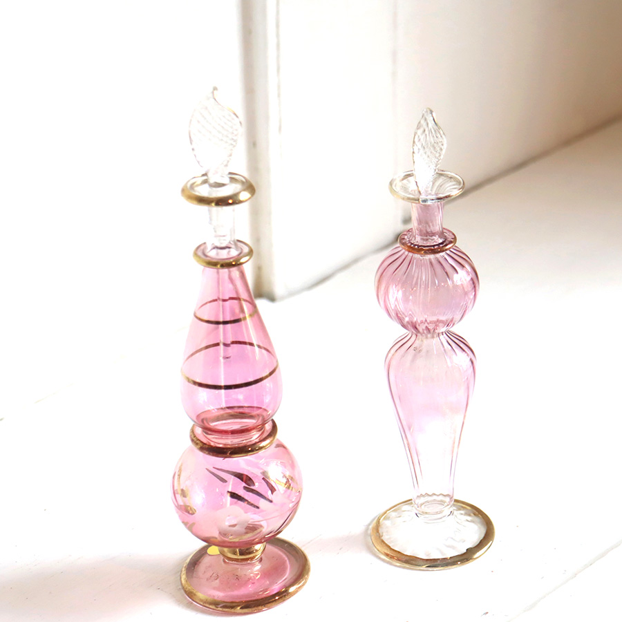 アラビアンな輝きの香水瓶。約15cmの高さのミニサイズ2本セットです。エジプトのカイロにて職人さんが一つ一つ手作りで作っているので、カラーやデザインのバリエーションも様々です。