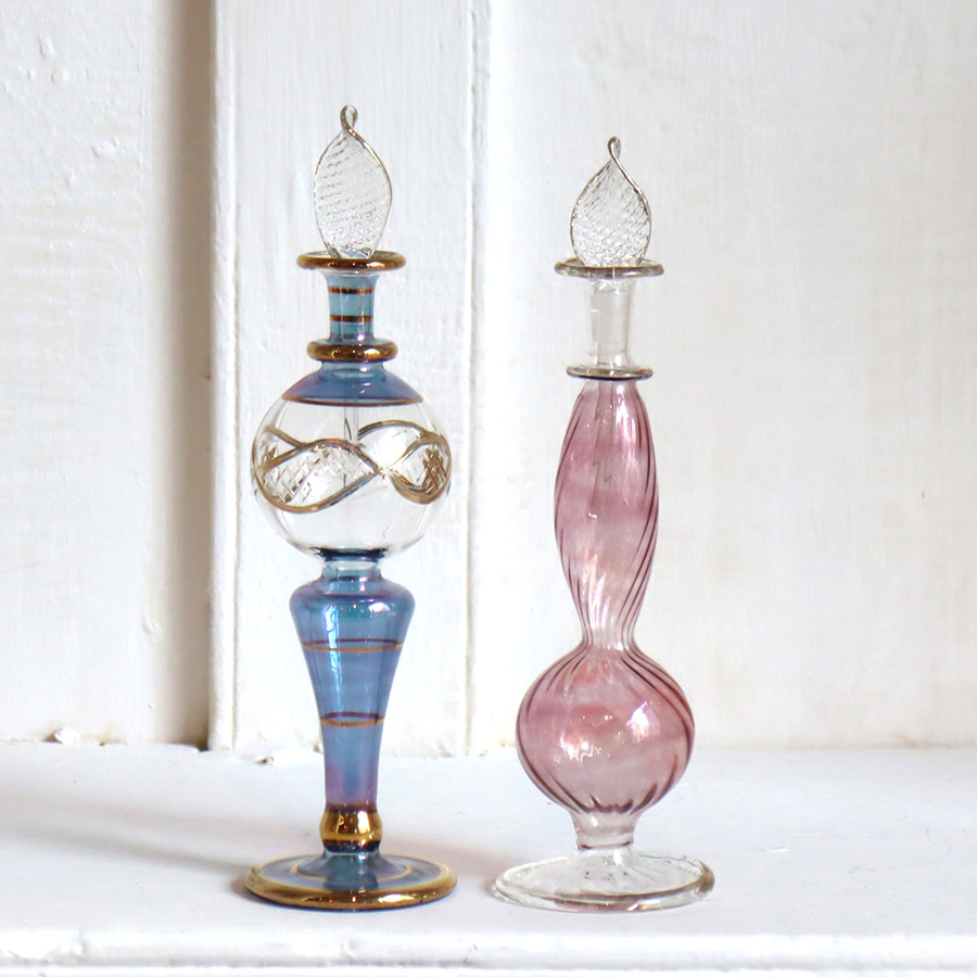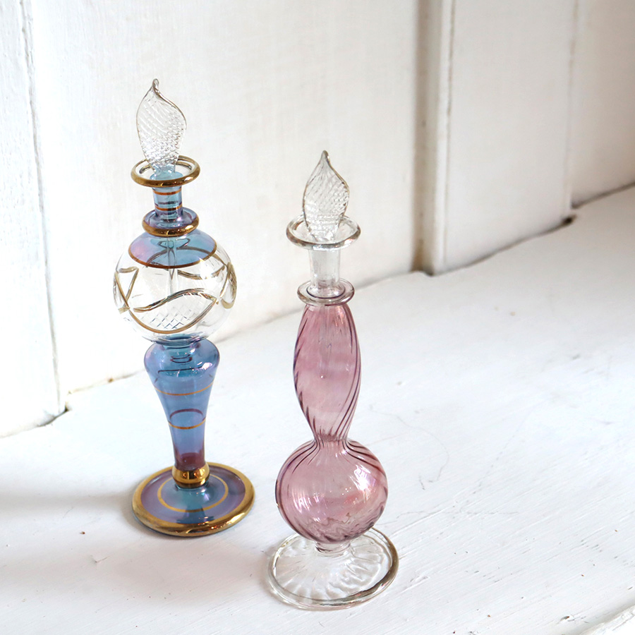 アラビアンな輝きの香水瓶。約15cmの高さのミニサイズ2本セットです。エジプトのカイロにて職人さんが一つ一つ手作りで作っているので、カラーやデザインのバリエーションも様々です。