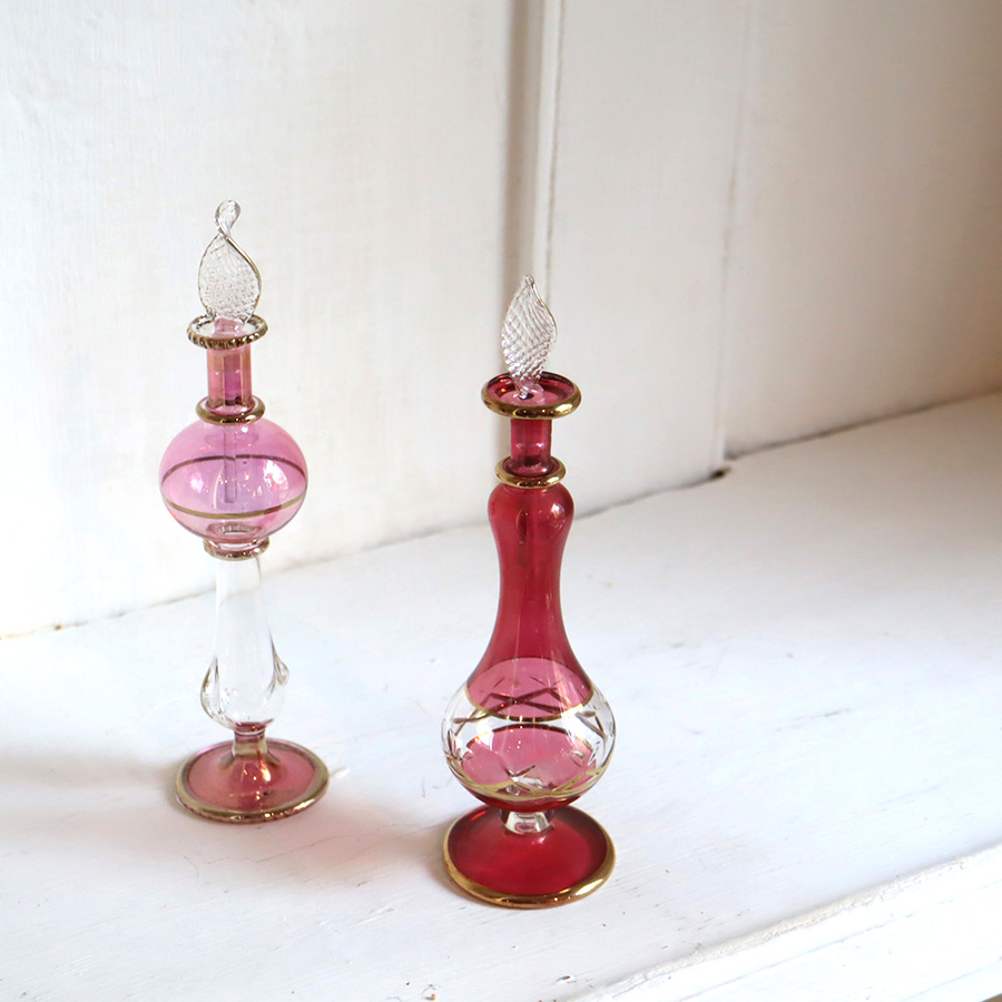 アラビアンな輝きの香水瓶。約15cmの高さのミニサイズ2本セットです。エジプトのカイロにて職人さんが一つ一つ手作りで作っているので、カラーやデザインのバリエーションも様々です。