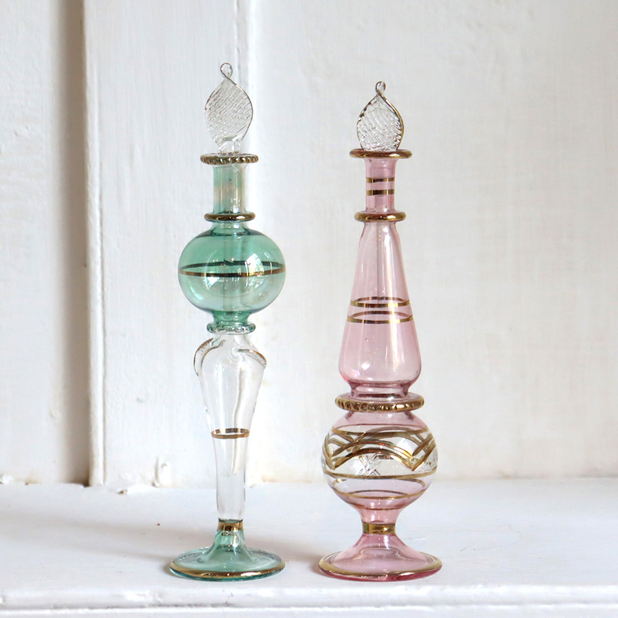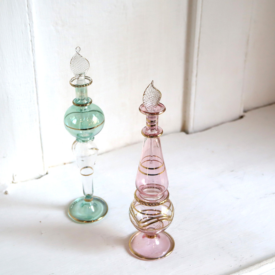 アラビアンな輝きの香水瓶。約15cmの高さのミニサイズ2本セットです。エジプトのカイロにて職人さんが一つ一つ手作りで作っているので、カラーやデザインのバリエーションも様々です。