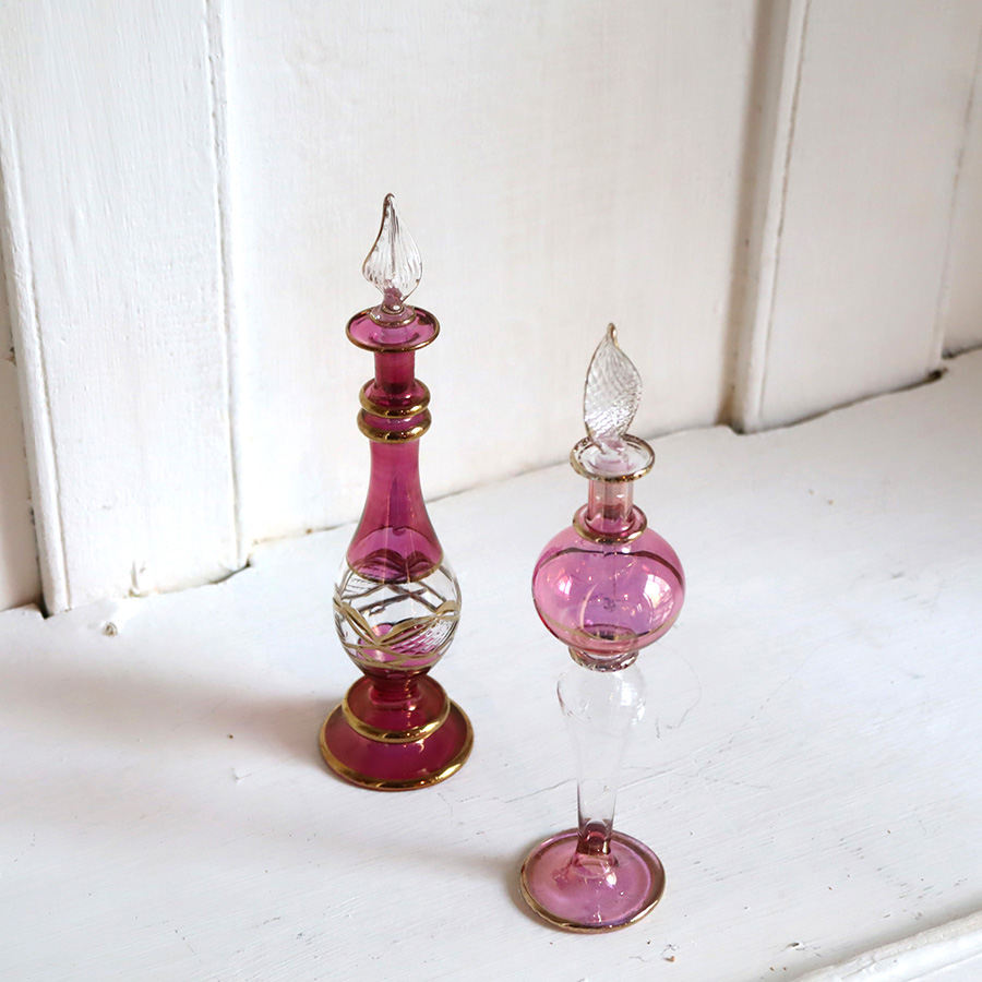 アラビアンな輝きの香水瓶。約15cmの高さのミニサイズ2本セットです。エジプトのカイロにて職人さんが一つ一つ手作りで作っているので、カラーやデザインのバリエーションも様々です。