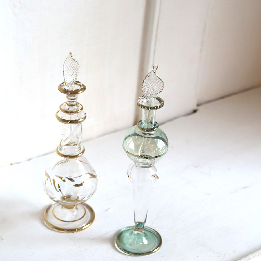アラビアンな輝きの香水瓶。約15cmの高さのミニサイズ2本セットです。エジプトのカイロにて職人さんが一つ一つ手作りで作っているので、カラーやデザインのバリエーションも様々です。