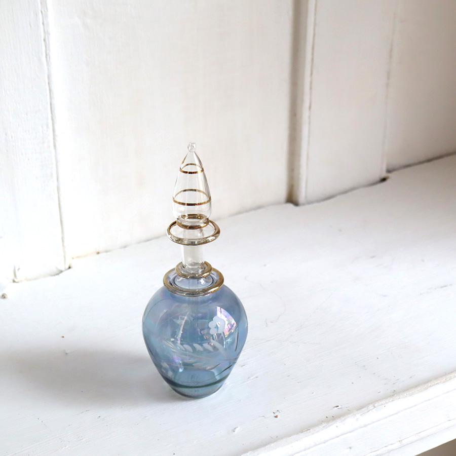 ガラス発祥の地といわれるエジプトで、ひとつひとつ手作りされているガラス瓶です。切子細工で表現された草花モチーフやゴールドの着彩、フリル状のガラスなど小さいながらも職人さんの技が光っています。
