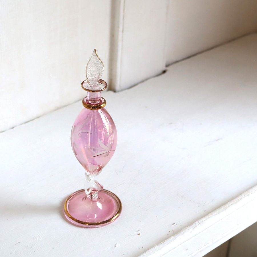 ガラス発祥の地といわれるエジプトで、ひとつひとつ手作りされているガラス瓶です。切子細工で表現された草花モチーフやゴールドの着彩、フリル状のガラスなど小さいながらも職人さんの技が光っています。