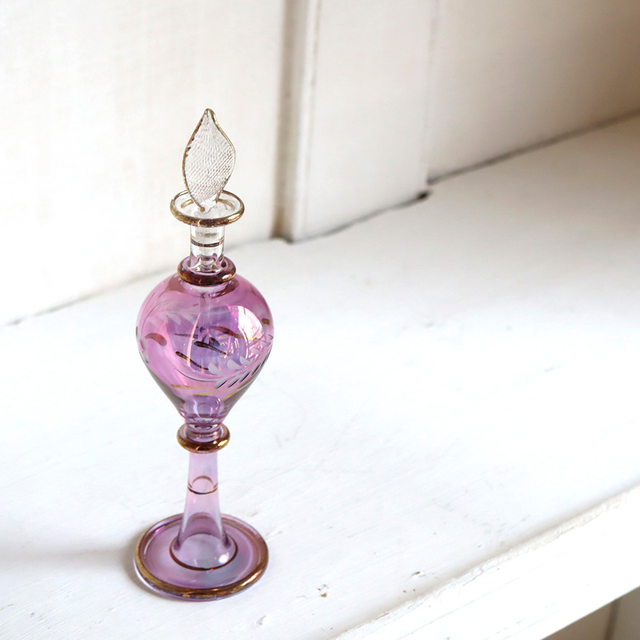 ガラス発祥の地といわれるエジプトで、ひとつひとつ手作りされているガラス瓶です。切子細工で表現された草花モチーフやゴールドの着彩、フリル状のガラスなど小さいながらも職人さんの技が光っています。