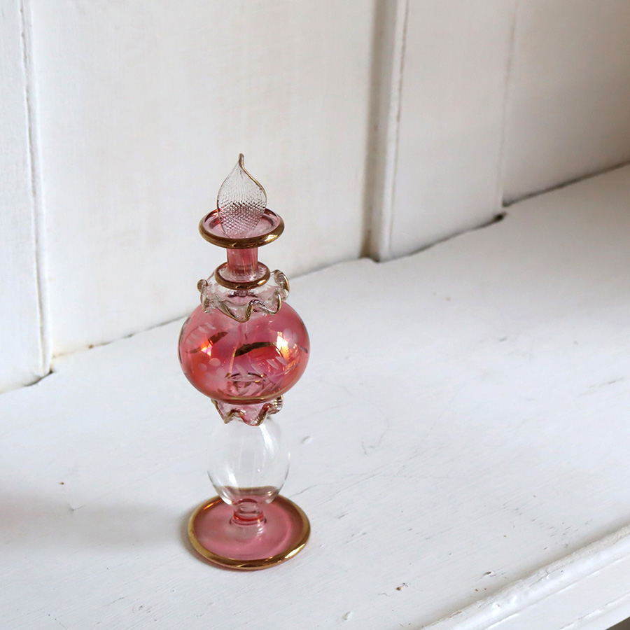 ガラス発祥の地といわれるエジプトで、ひとつひとつ手作りされているガラス瓶です。切子細工で表現された草花モチーフやゴールドの着彩、フリル状のガラスなど小さいながらも職人さんの技が光っています。