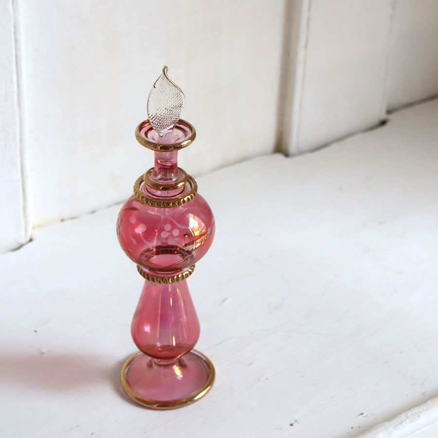 ガラス発祥の地といわれるエジプトで、ひとつひとつ手作りされているガラス瓶です。切子細工で表現された草花モチーフやゴールドの着彩、フリル状のガラスなど小さいながらも職人さんの技が光っています。