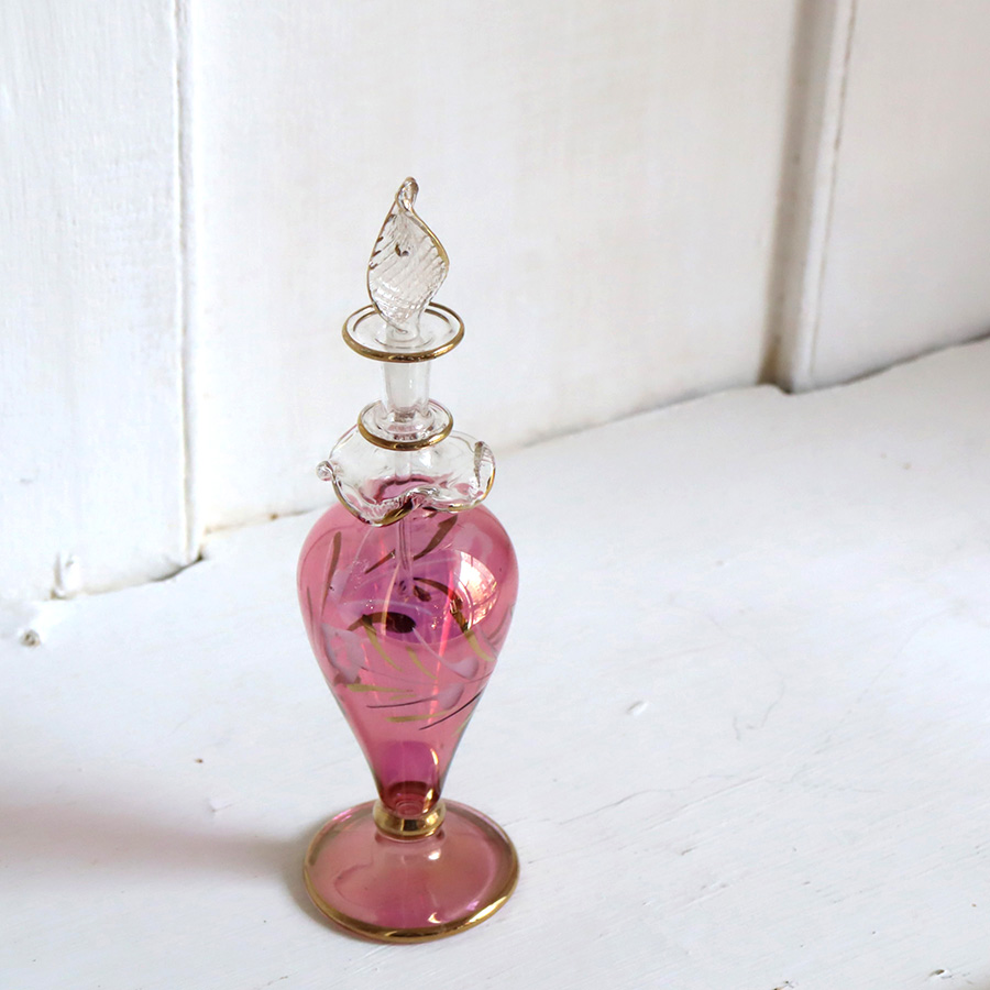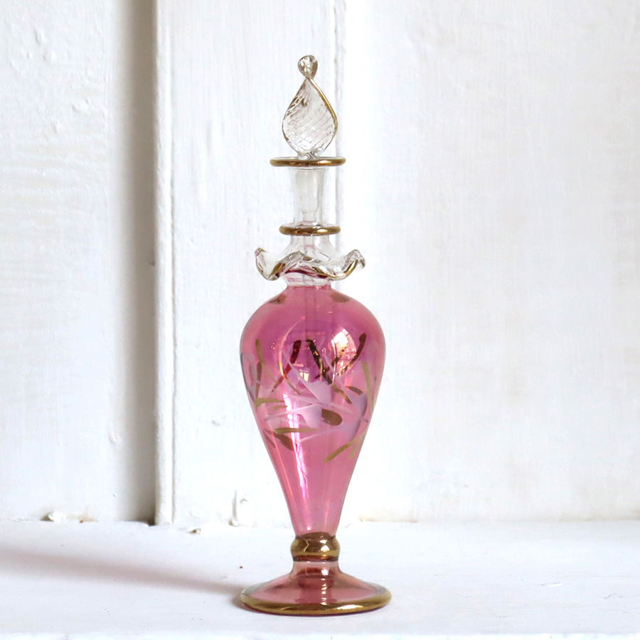 ガラス発祥の地といわれるエジプトで、ひとつひとつ手作りされているガラス瓶です。切子細工で表現された草花モチーフやゴールドの着彩、フリル状のガラスなど小さいながらも職人さんの技が光っています。
