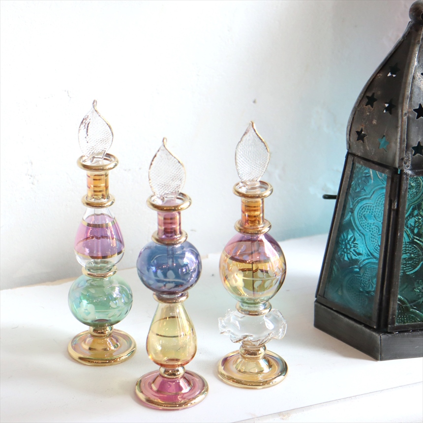エキゾチックな雰囲気の3色使いのガラス瓶です。
