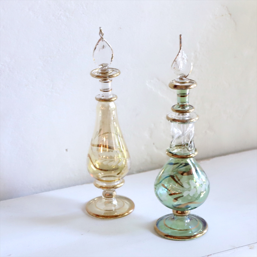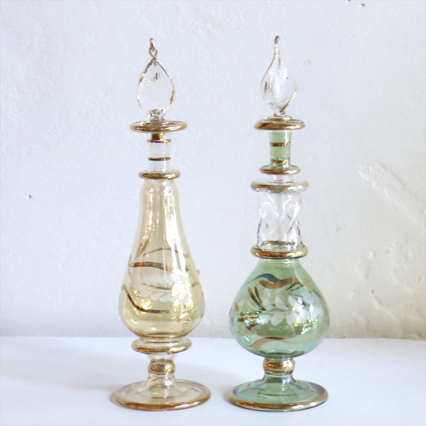アラビアンな輝きの香水瓶。約15cmの高さのミニサイズ2本セットです。エジプトのカイロにて職人さんが一つ一つ手作りで作っているので、カラーやデザインのバリエーションも様々です。