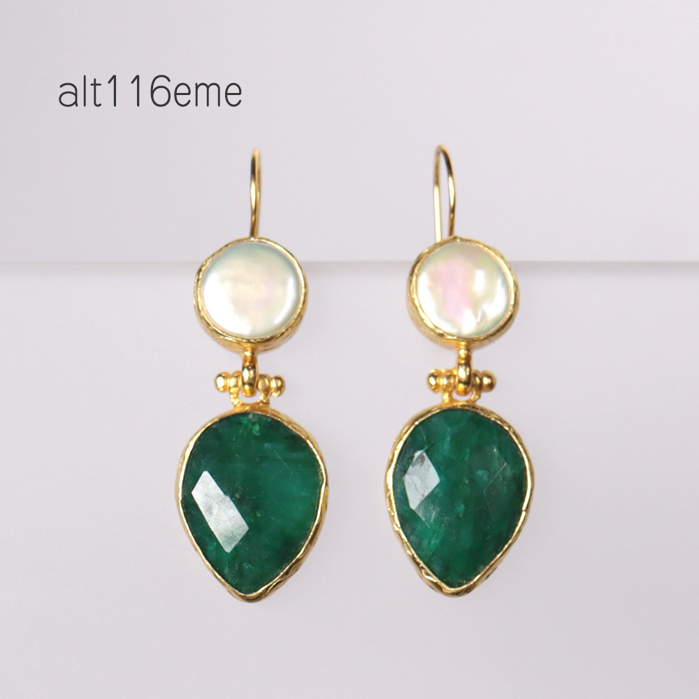 バロックパールと鮮やかなエメラルドの2ドロップピアス。、大振りで、古代遺跡から出てきたイメージのままのデザインです。※パール直径約1cm