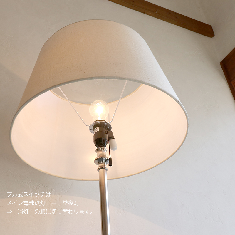 フロアライトのベースのみ単体の販売です。口金E26 と E12の電球を使用。プルダウン式のスイッチで、メイン電球点灯→常夜灯→消灯 に切り替わります。