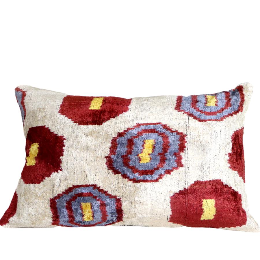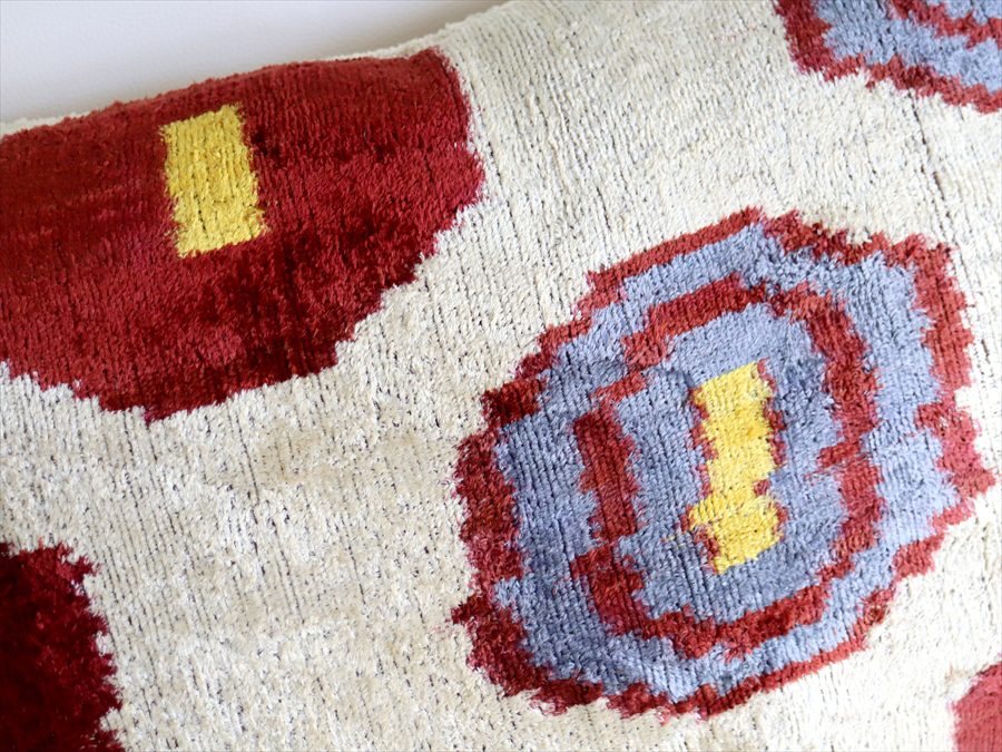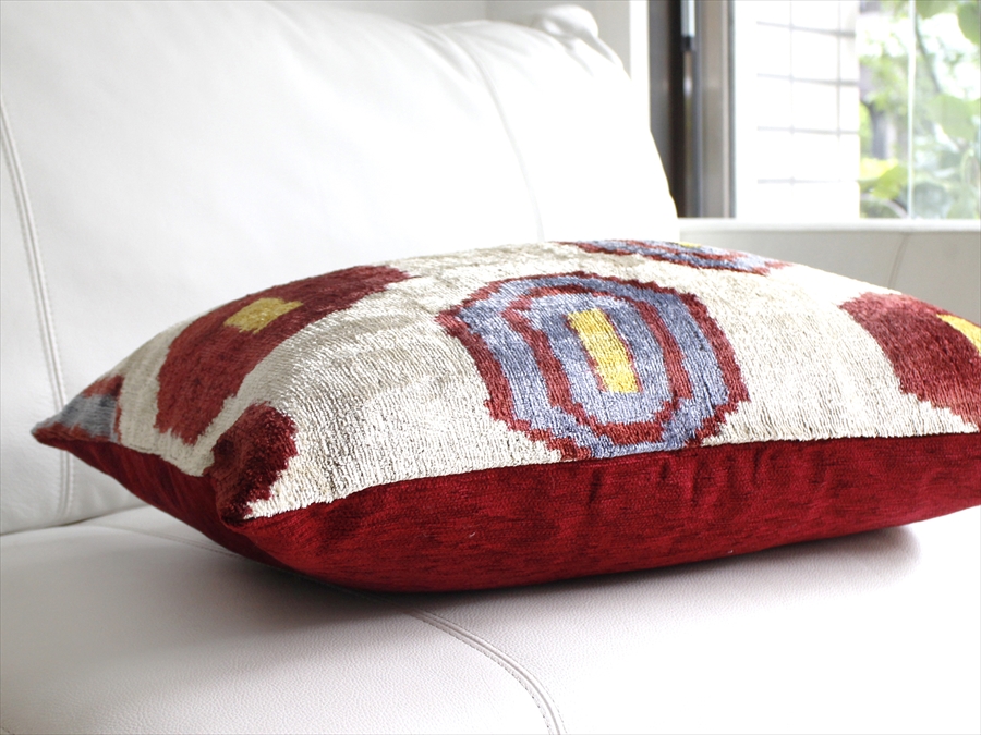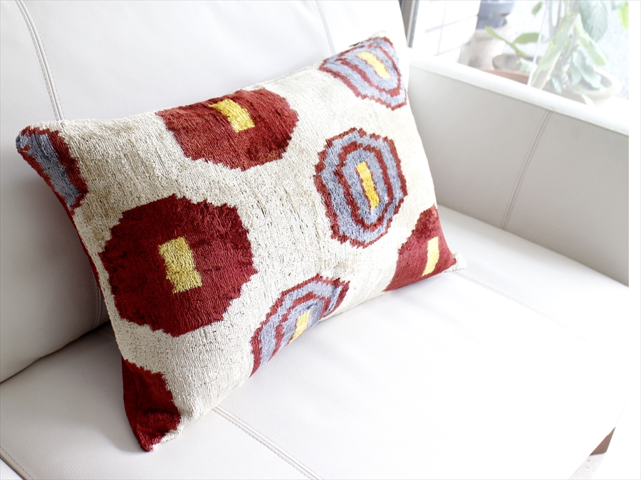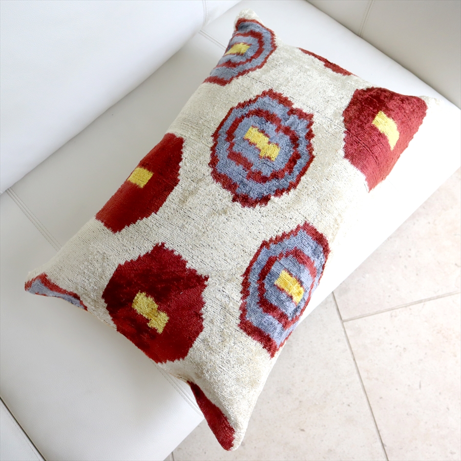 ウズベキスタン・アトラス(イカット・絣) クッション 横長クッションカバー・ピローケース シルクベルベット 赤い水玉/裏面の色はボルドー 59x37cm