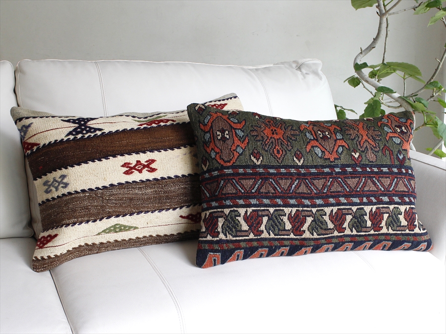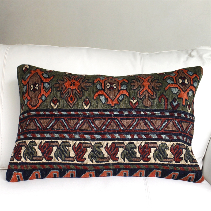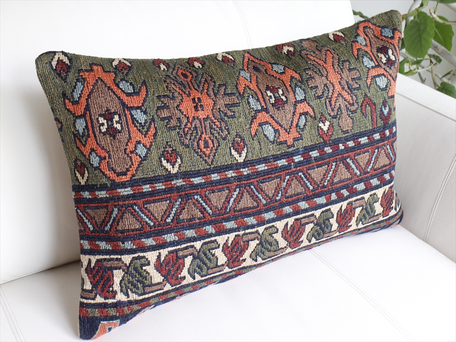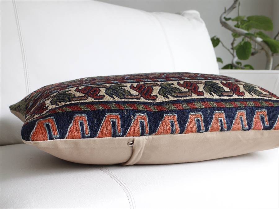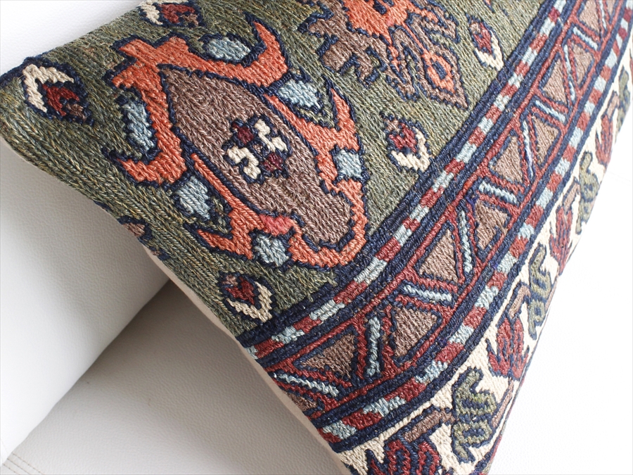 コーカサス(=現在のアゼルバイジャン)地方のオールドキリムで、スマックという非常に手の込んだキリムの織りの技法で織られているため、厚手でしっかりした織り地です。表面は刺繍のように見えます。