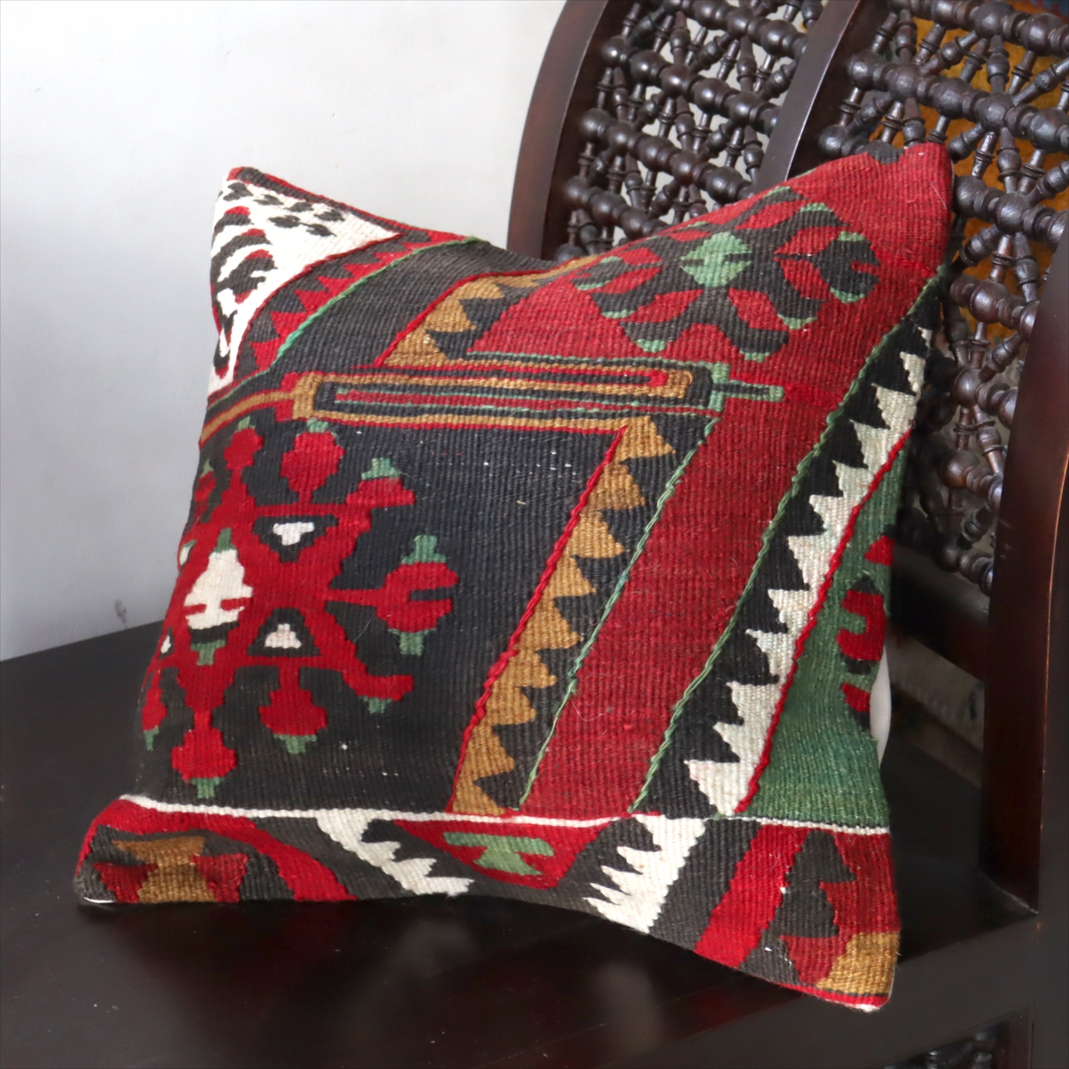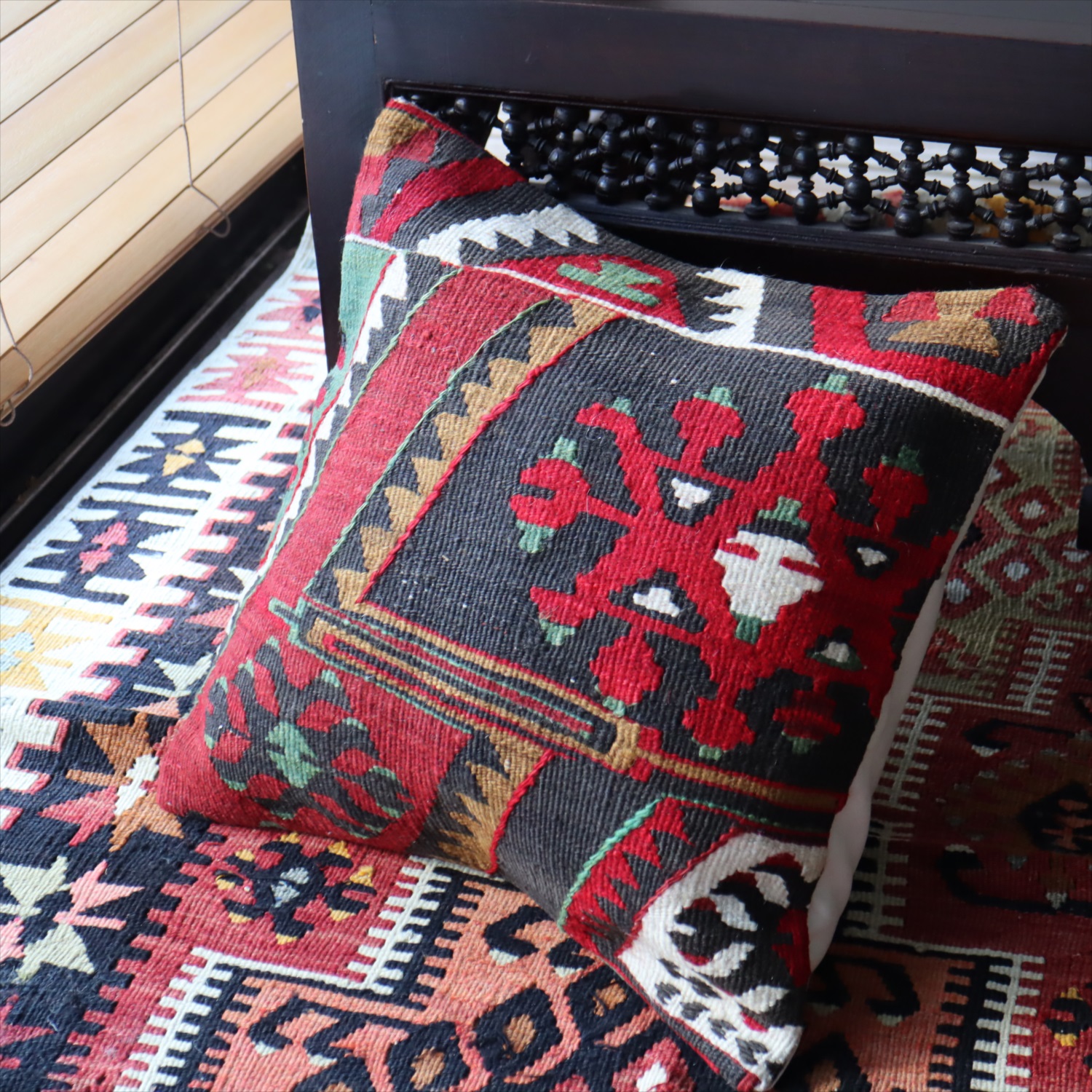 細い糸を使って織られた大型の平織りキリムをカットして作ったクッションカバーです。表面はウールのヴィンテージキリム、裏面は無地のコットン地です。