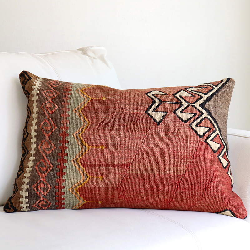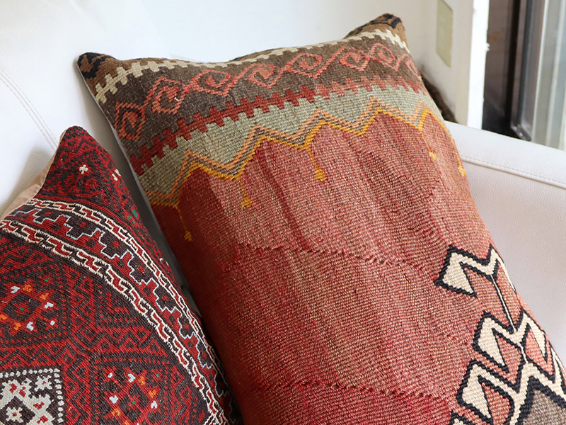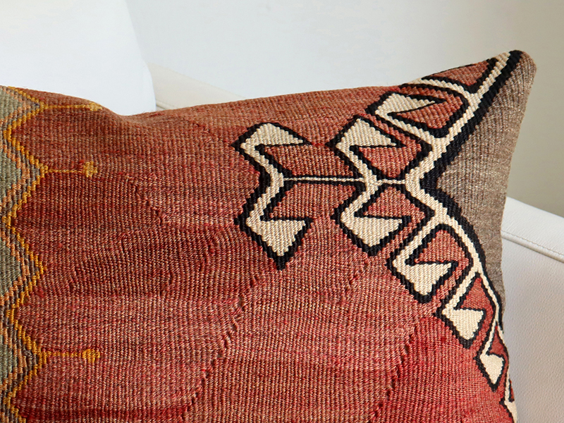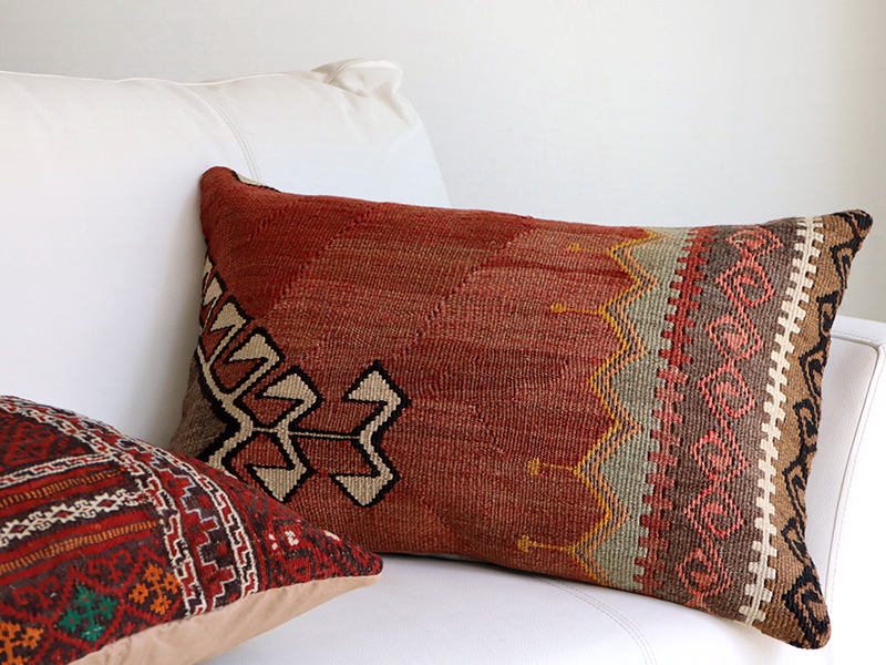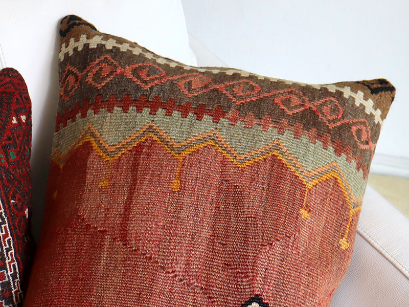 トルコ東北部、アルメニアとの国境に近いカルス地方のオールドキリムからのカット。赤みのはいったブラウンとグレーをベースに、オレンジやピンクを用いた特徴的な配色。パープルだけ褪色してグレーのような色になっていますけれども、全体に濃いめの色合いを残しています。
