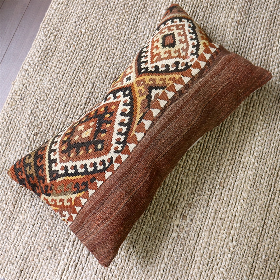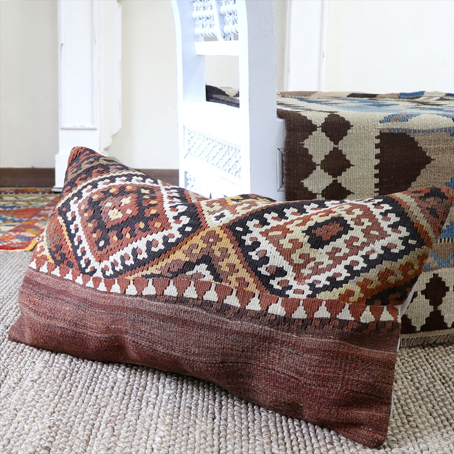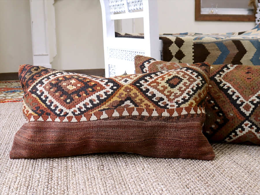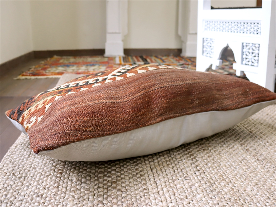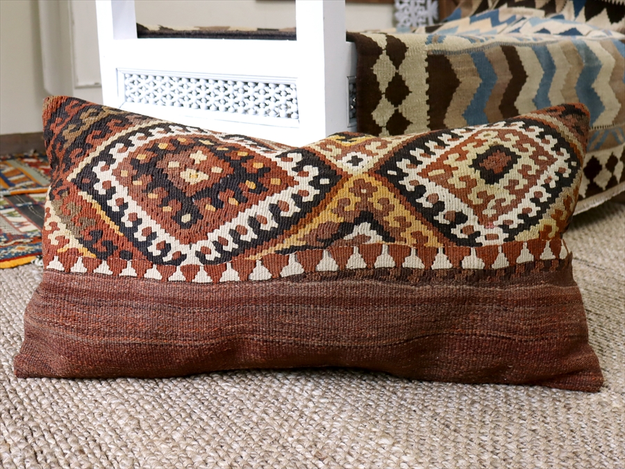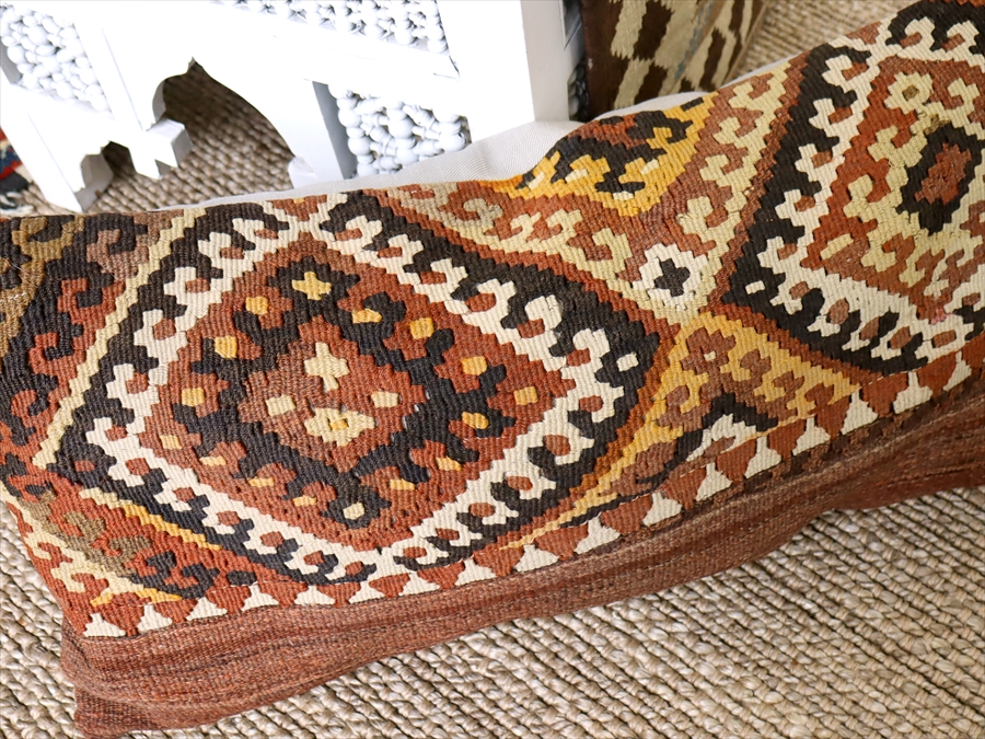 エーゲ海に突き出したアナトリア南西部、フェティエ地方の古いキリムからのカットです。複雑に入り組んだドラゴンの爪のモチーフとが特徴です。ブラウンの色使いと白のコントラストが美しいキリムクッションです。