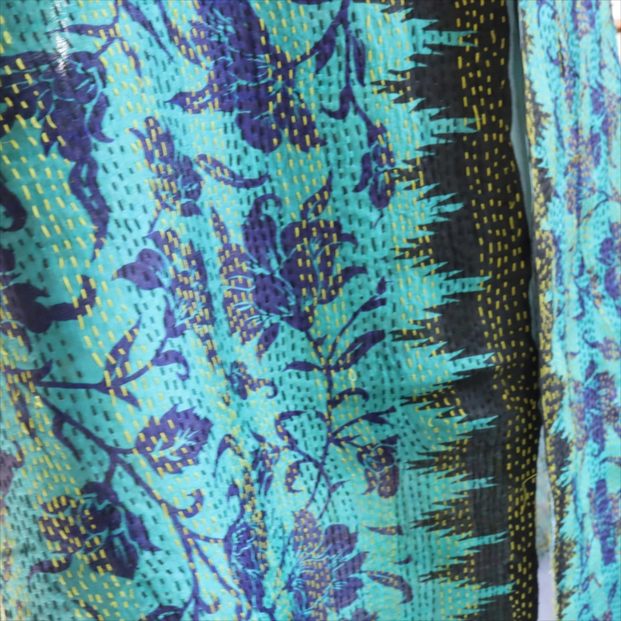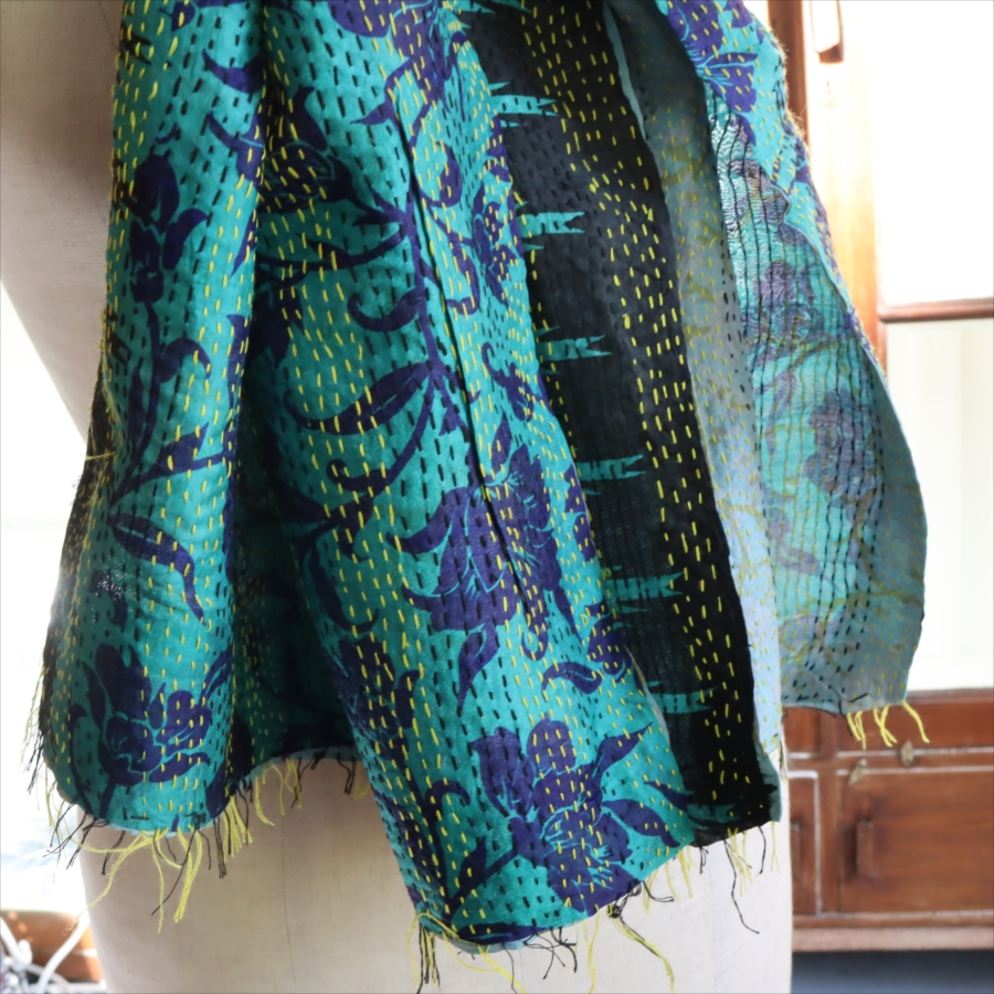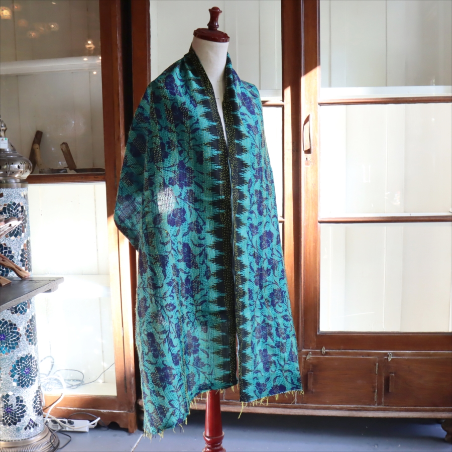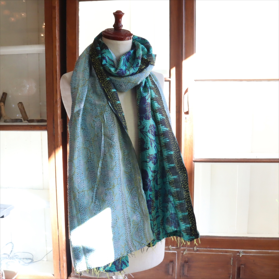カンタ刺繍のシルクストールです。シルクの光沢感、布地の色柄とビビットな刺繍が個性的な布。ベースのシルク地はサリー(女性の衣装)のリサイクルで、表と裏に違う色柄の布を合わせて手作業で縫い合わされています。表裏ともにシルクなので軽くてさらりとした肌触りです。