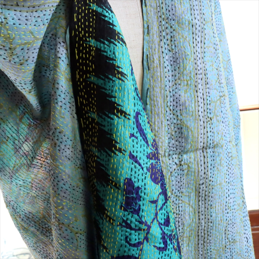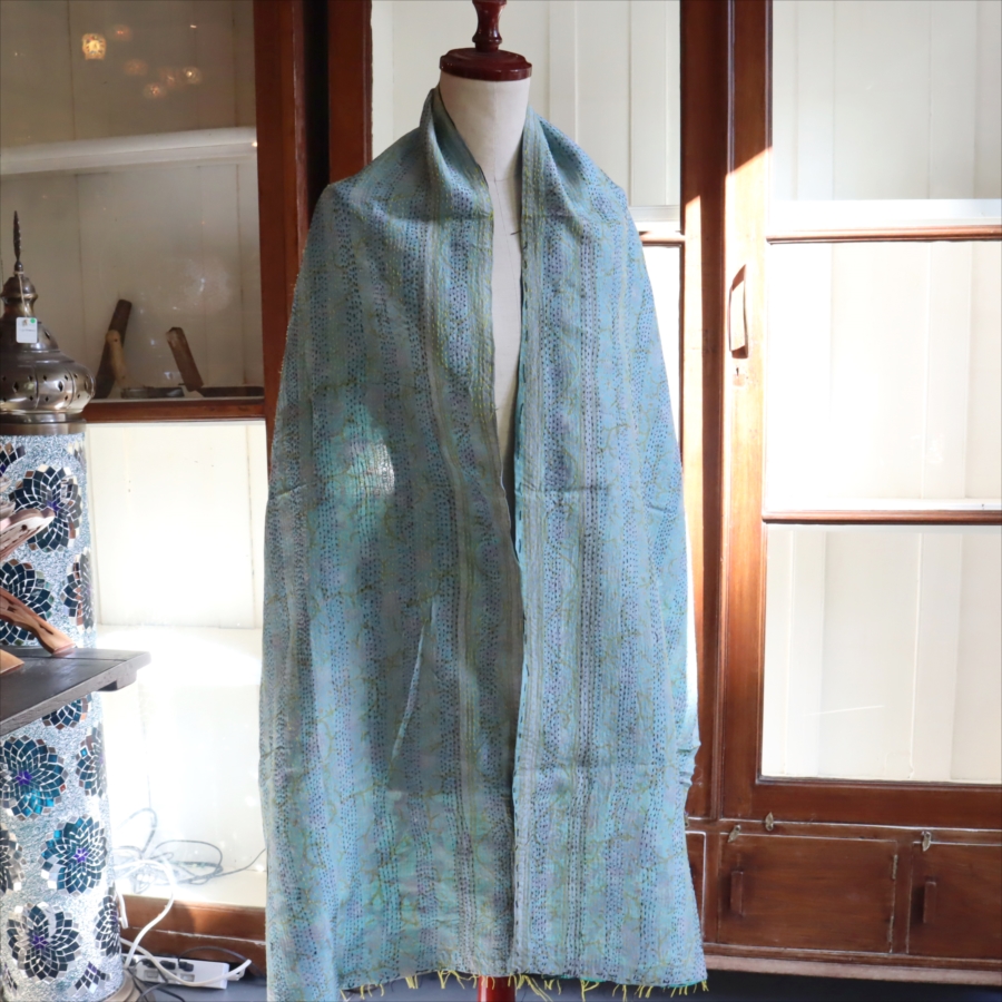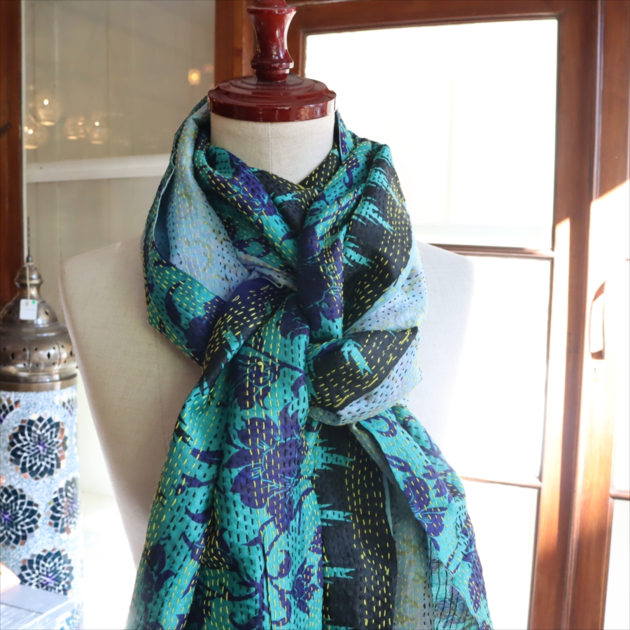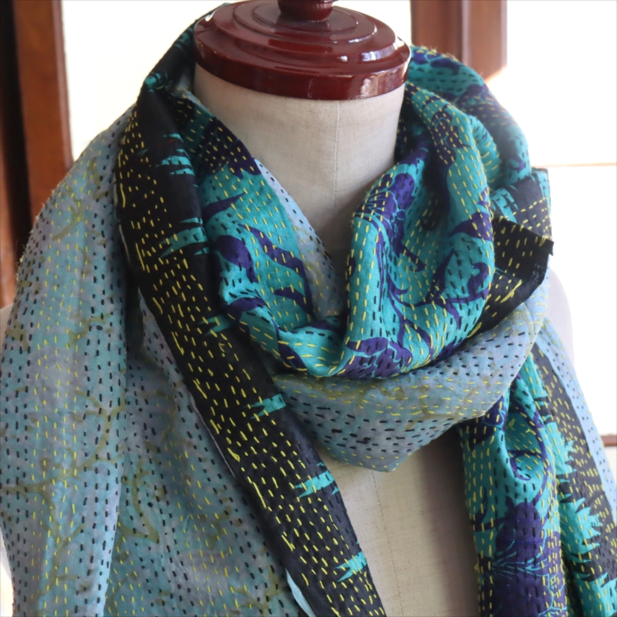 カンタ刺繍のシルクストールです。シルクの光沢感、布地の色柄とビビットな刺繍が個性的な布。ベースのシルク地はサリー(女性の衣装)のリサイクルで、表と裏に違う色柄の布を合わせて手作業で縫い合わされています。表裏ともにシルクなので軽くてさらりとした肌触りです。