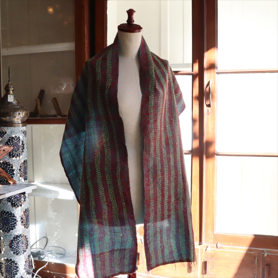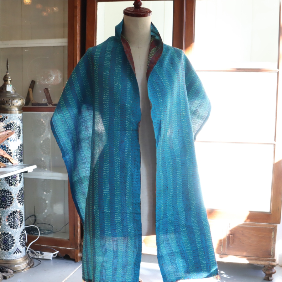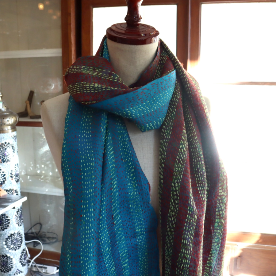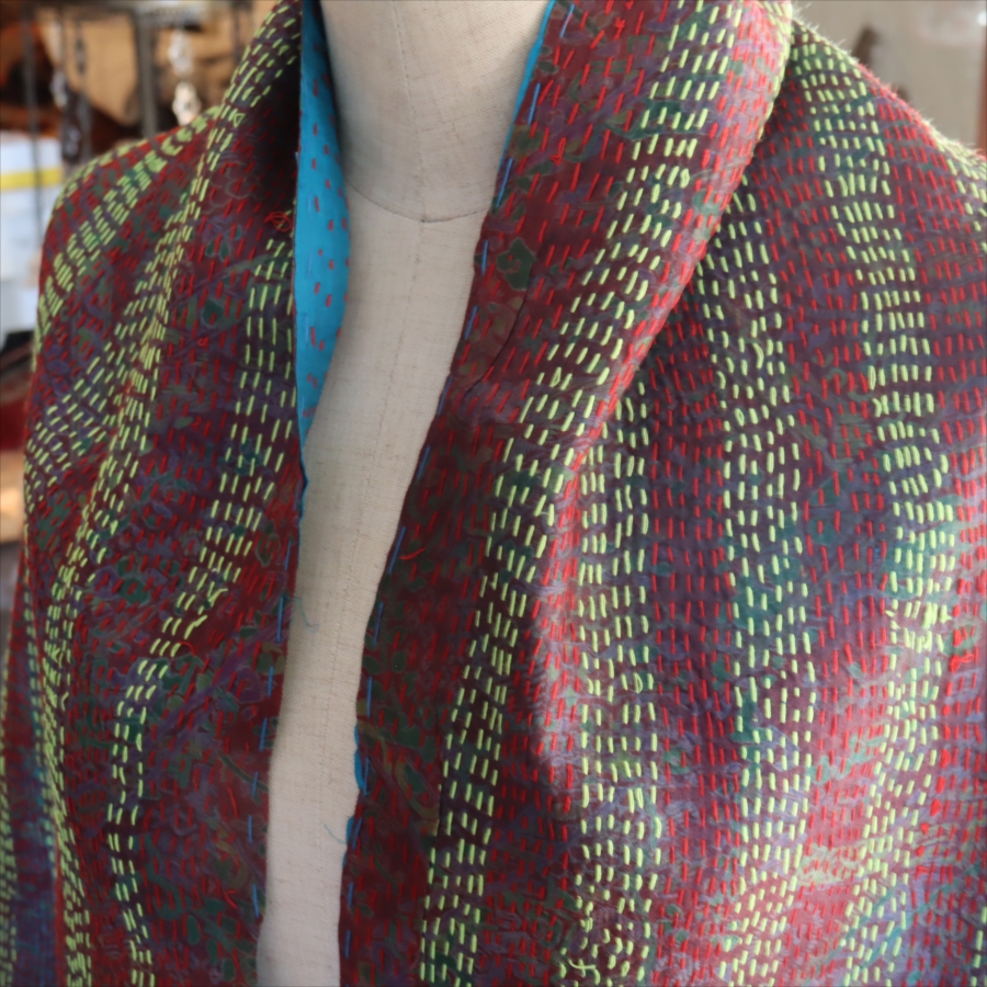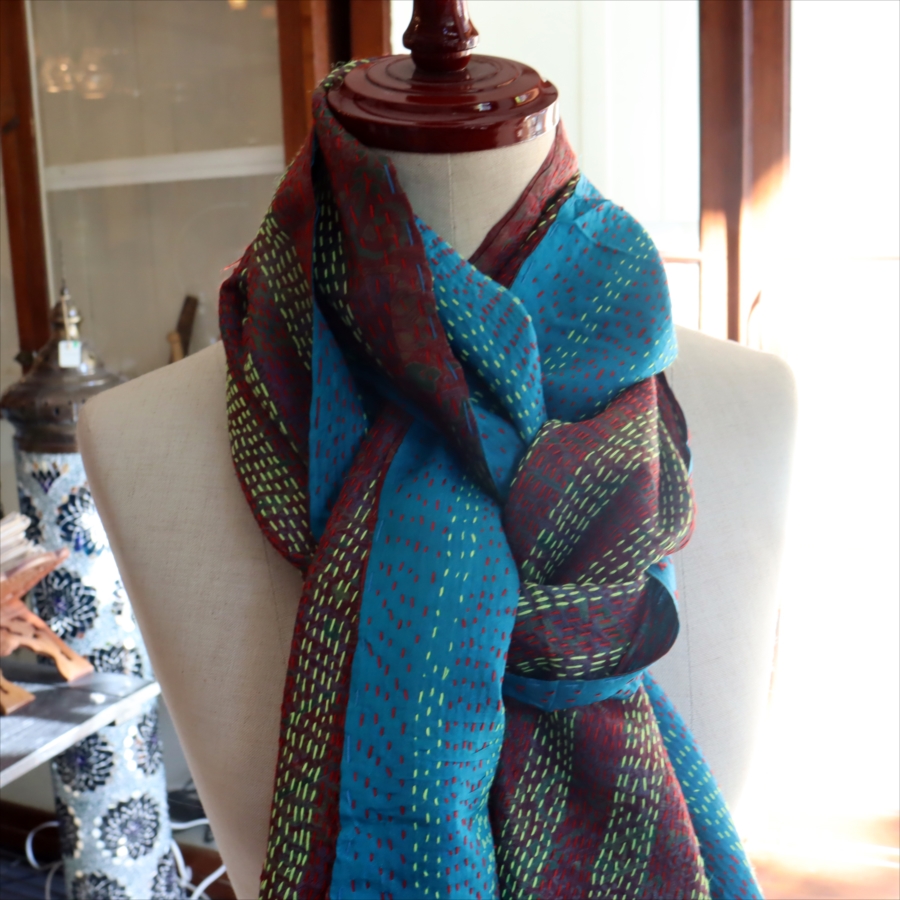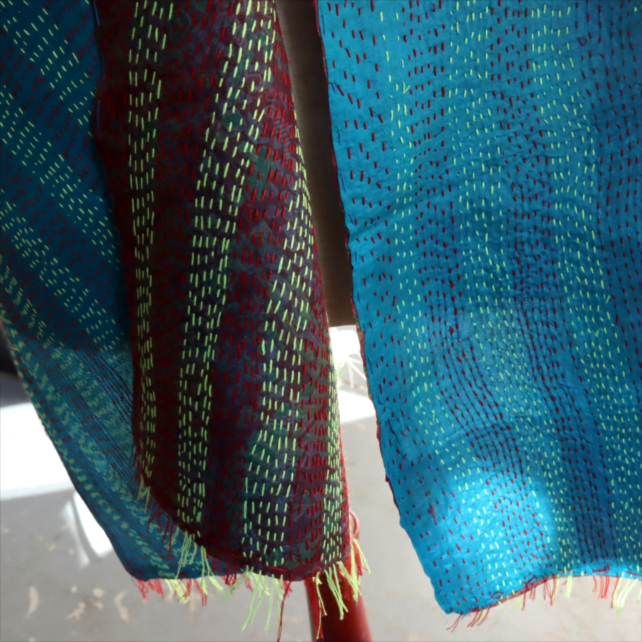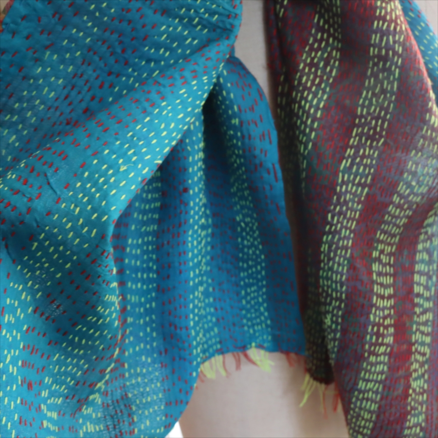 カンタ刺繍のシルクストールです。シルクの光沢感、布地の色柄とビビットな刺繍が個性的な布。ベースのシルク地はサリー(女性の衣装)のリサイクルで、表と裏に違う色柄の布を合わせて手作業で縫い合わされています。表裏ともにシルクなので軽くてさらりとした肌触りです。