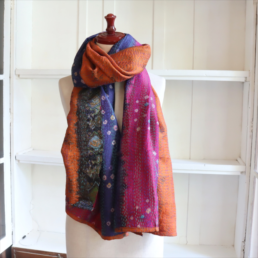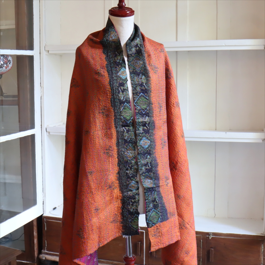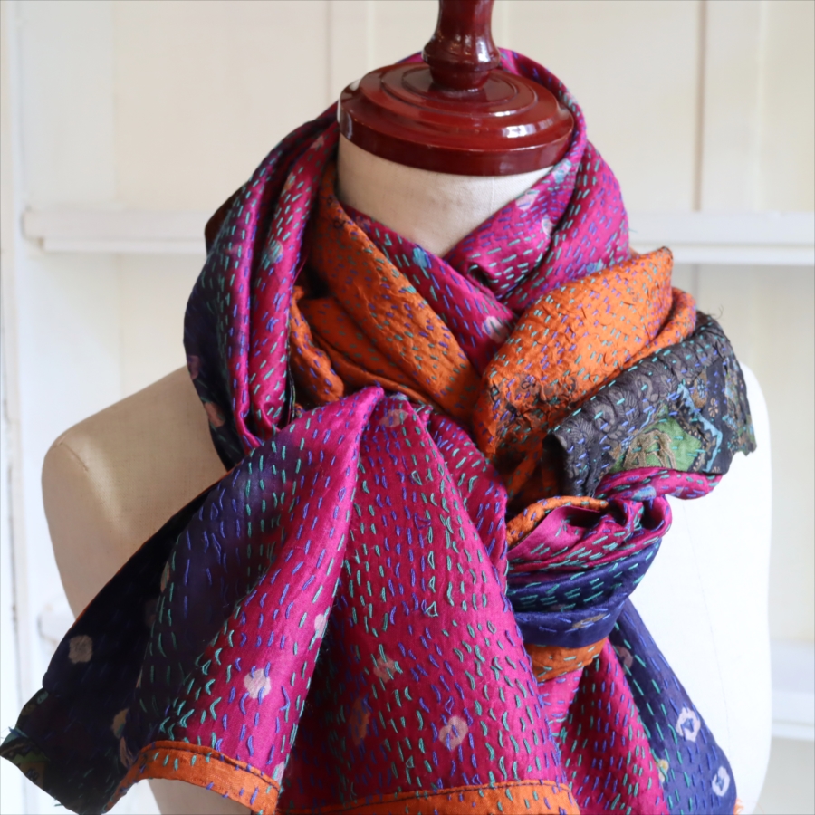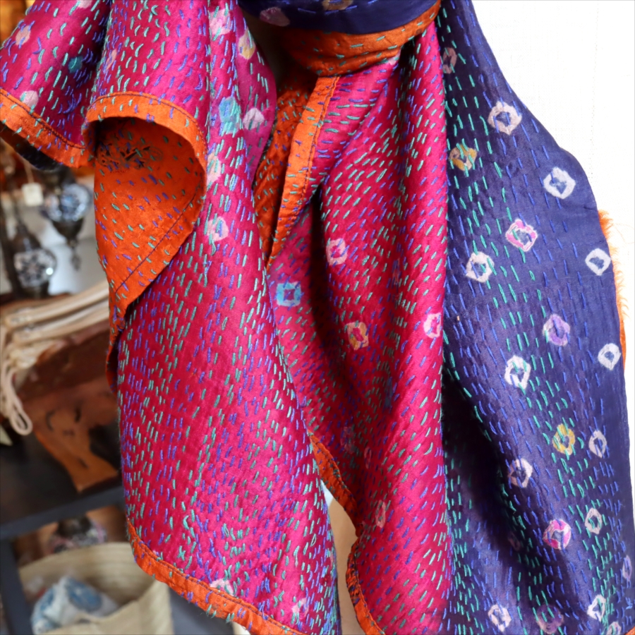 カンタ刺繍のシルクストールです。シルクの光沢感、布地の色柄とビビットな刺繍が個性的な布。ベースのシルク地はサリー(女性の衣装)のリサイクルで、表と裏に違う色柄の布を合わせて手作業で縫い合わされています。表裏ともにシルクなので軽くてさらりとした肌触りです。