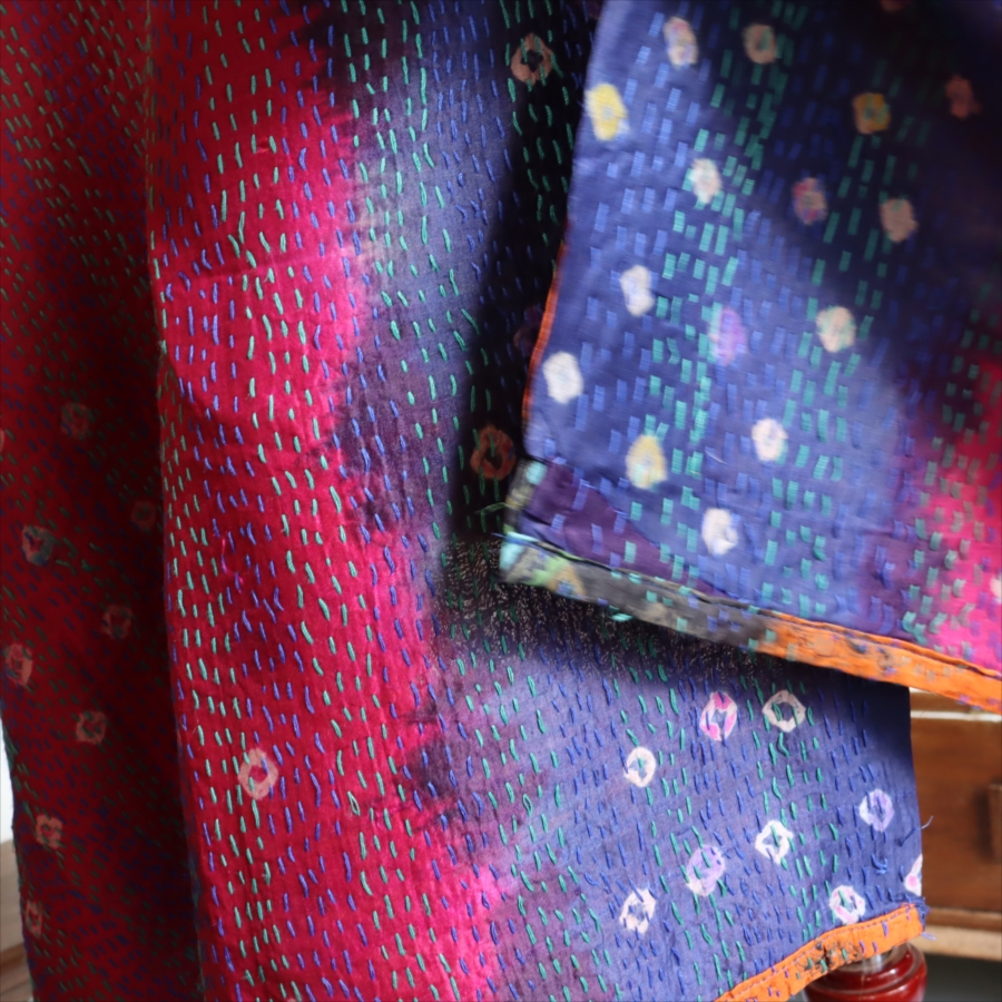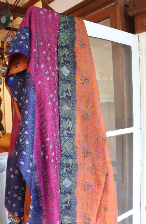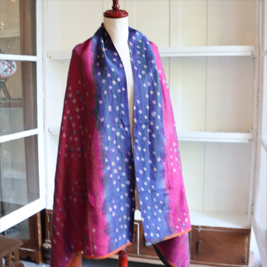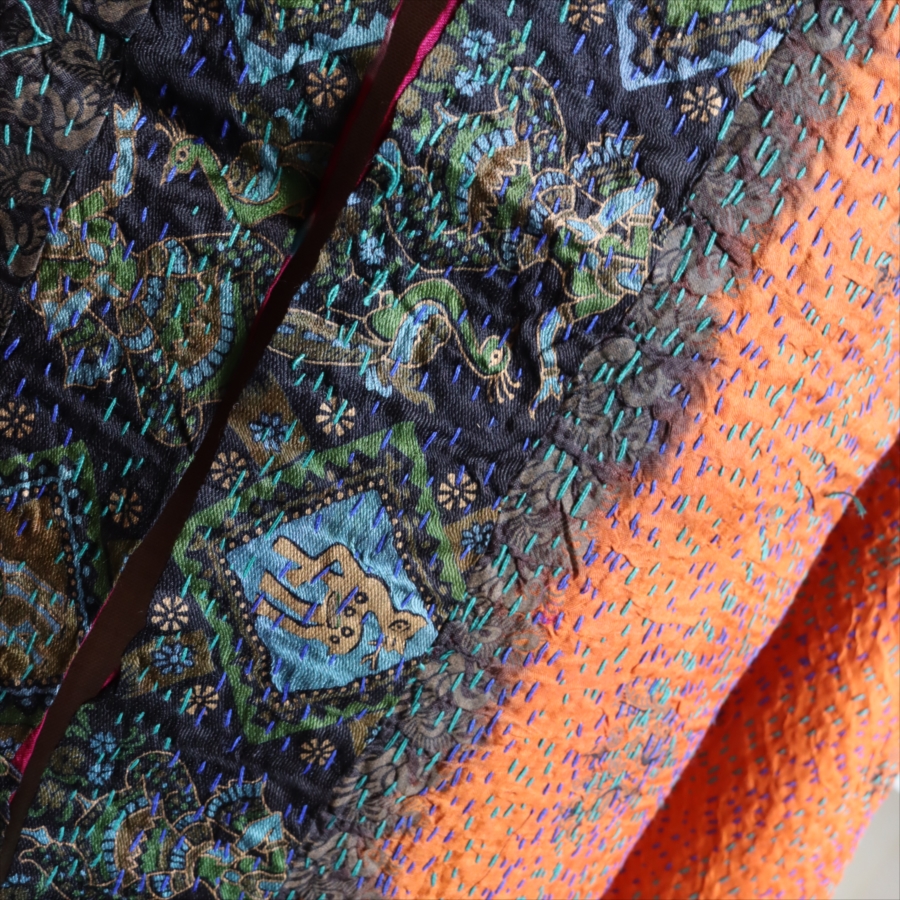 カンタ刺繍のシルクストールです。シルクの光沢感、布地の色柄とビビットな刺繍が個性的な布。ベースのシルク地はサリー(女性の衣装)のリサイクルで、表と裏に違う色柄の布を合わせて手作業で縫い合わされています。表裏ともにシルクなので軽くてさらりとした肌触りです。