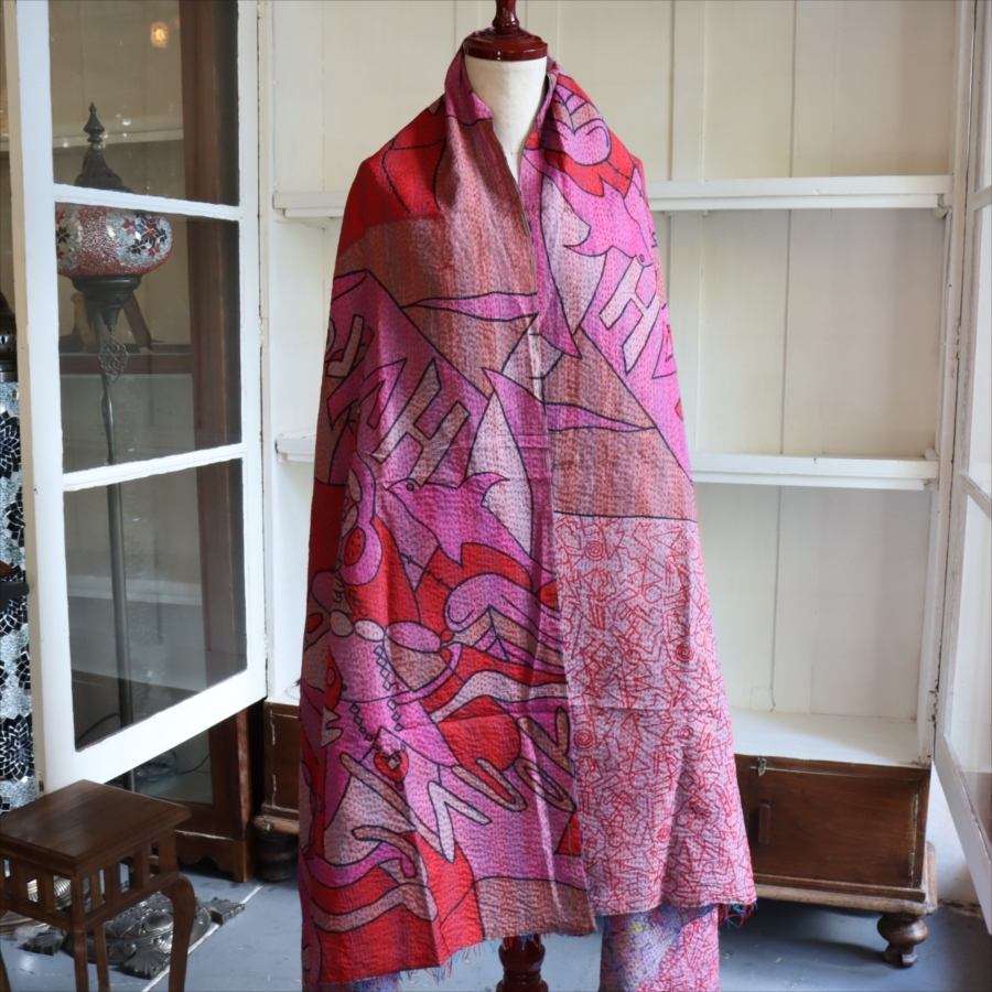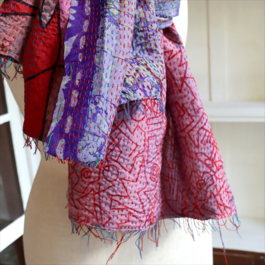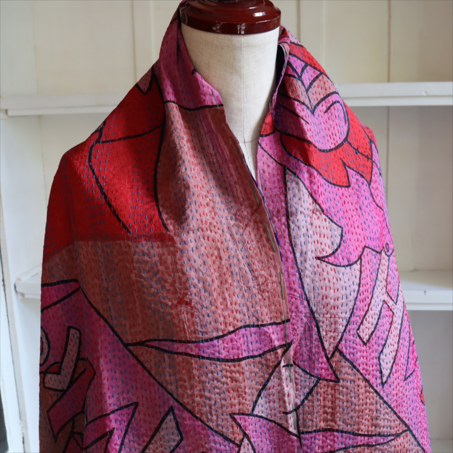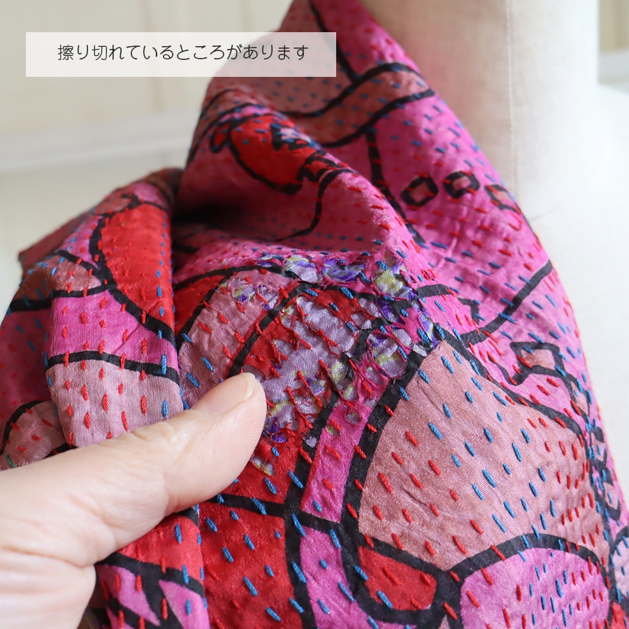 カンタ刺繍のシルクストールです。シルクの光沢感、布地の色柄とビビットな刺繍が個性的な布。ベースのシルク地はサリー(女性の衣装)のリサイクルで、表と裏に違う色柄の布を合わせて手作業で縫い合わされています。表裏ともにシルクなので軽くてさらりとした肌触りです。