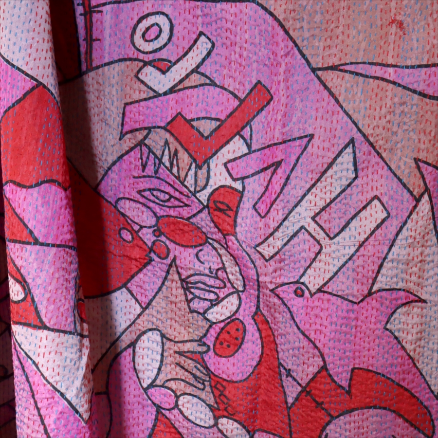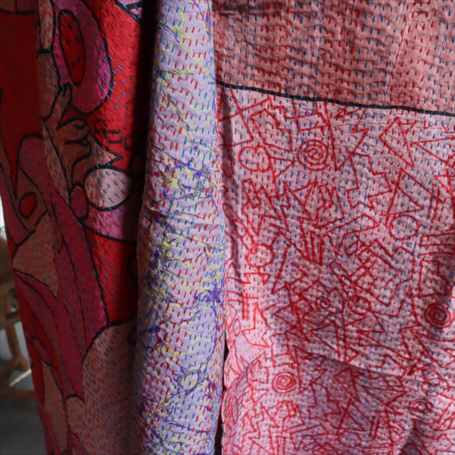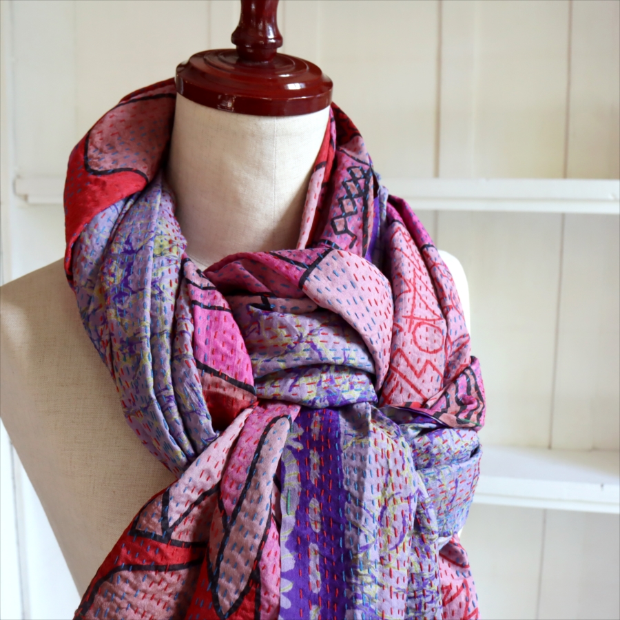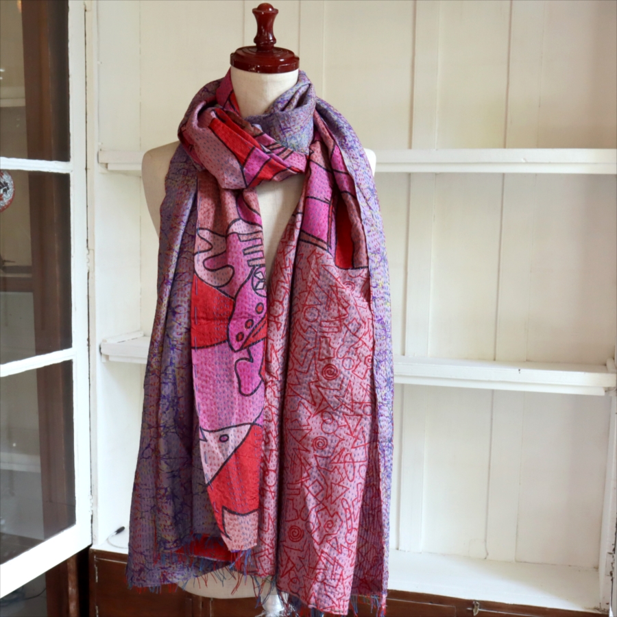 カンタ刺繍のシルクストールです。シルクの光沢感、布地の色柄とビビットな刺繍が個性的な布。ベースのシルク地はサリー(女性の衣装)のリサイクルで、表と裏に違う色柄の布を合わせて手作業で縫い合わされています。表裏ともにシルクなので軽くてさらりとした肌触りです。