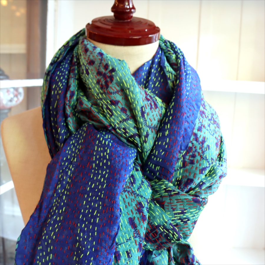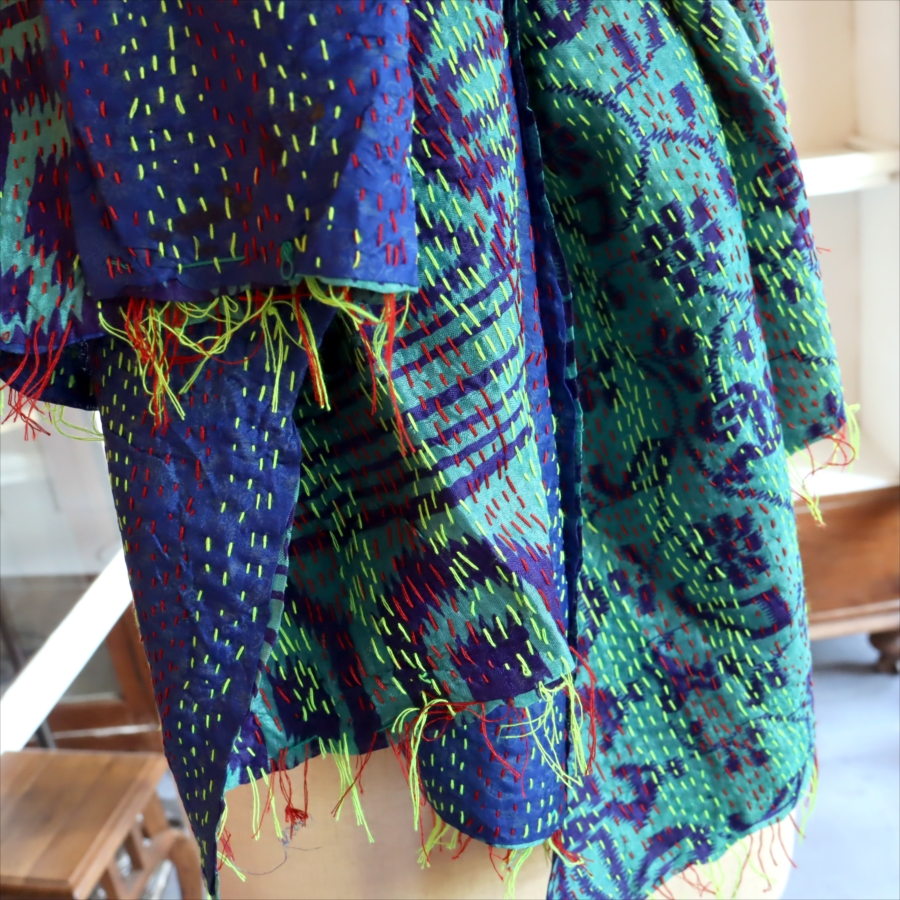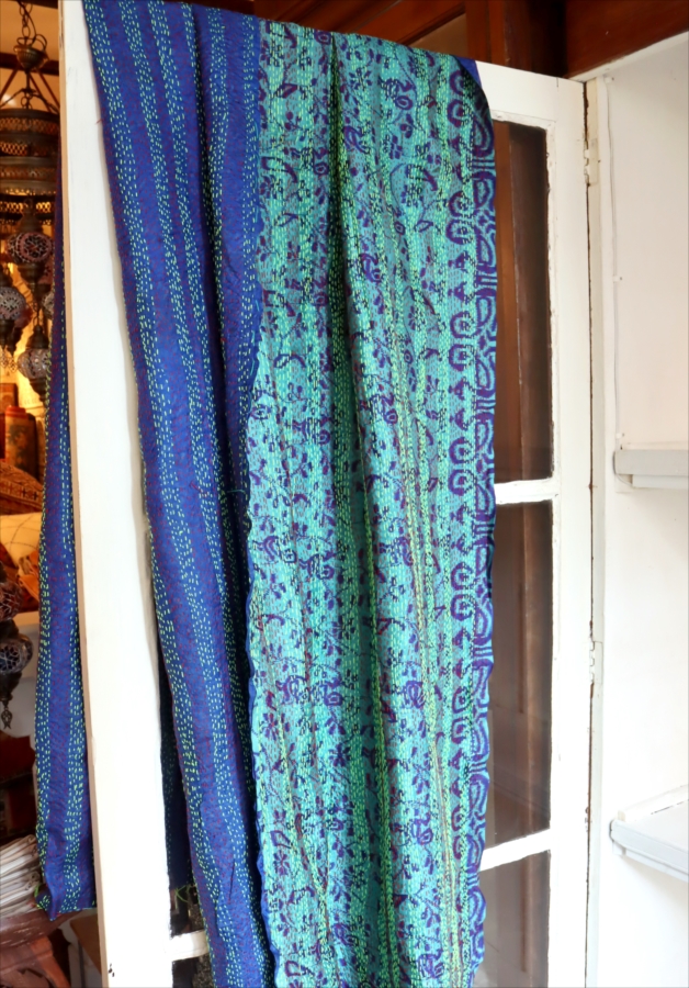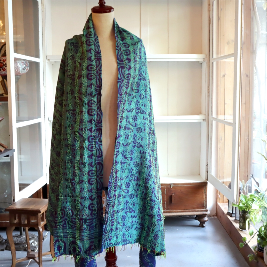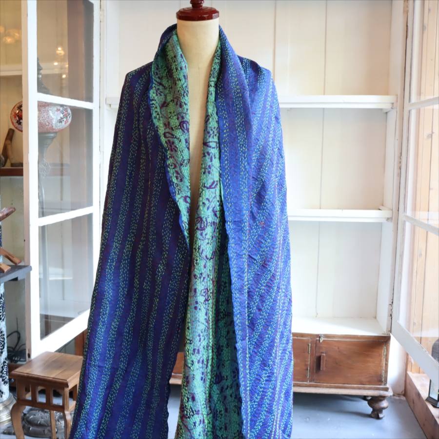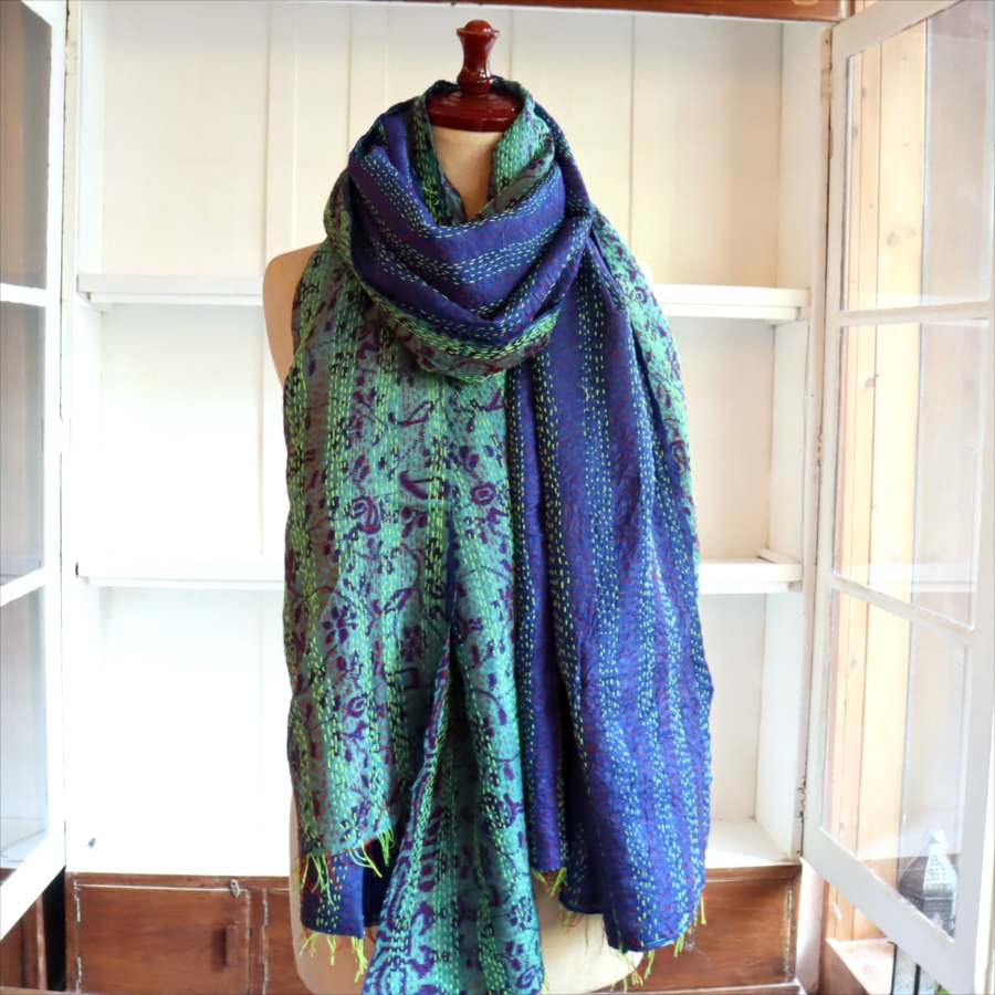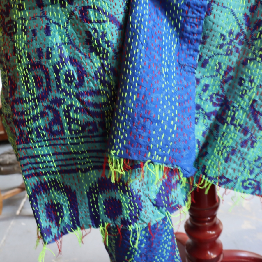 カンタ刺繍のシルクストールです。シルクの光沢感、布地の色柄とビビットな刺繍が個性的な布。ベースのシルク地はサリー(女性の衣装)のリサイクルで、表と裏に違う色柄の布を合わせて手作業で縫い合わされています。表裏ともにシルクなので軽くてさらりとした肌触りです。