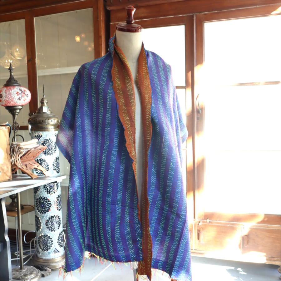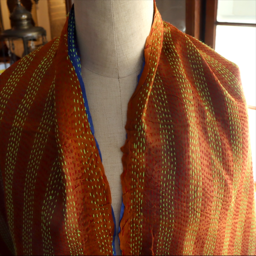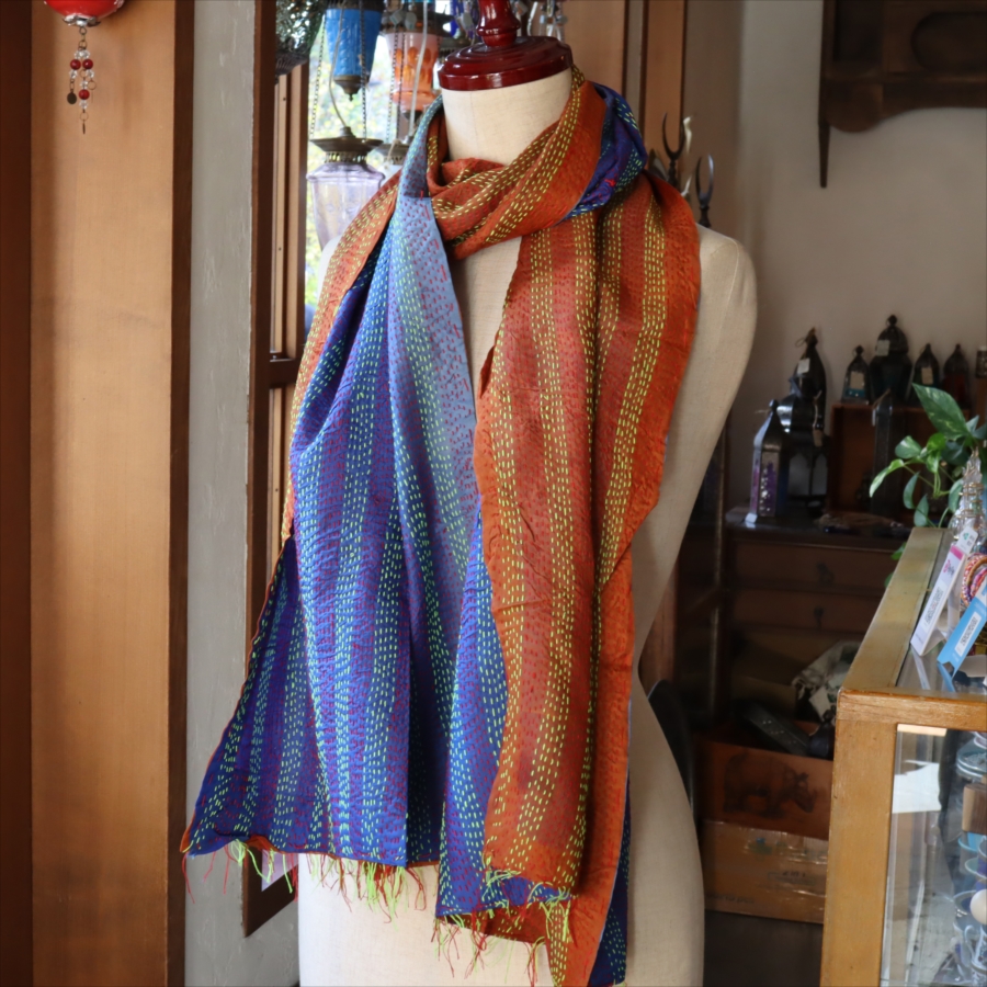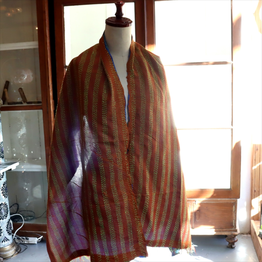 カンタ刺繍のシルクストールです。シルクの光沢感、布地の色柄とビビットな刺繍が個性的な布。ベースのシルク地はサリー(女性の衣装)のリサイクルで、表と裏に違う色柄の布を合わせて手作業で縫い合わされています。表裏ともにシルクなので軽くてさらりとした肌触りです。