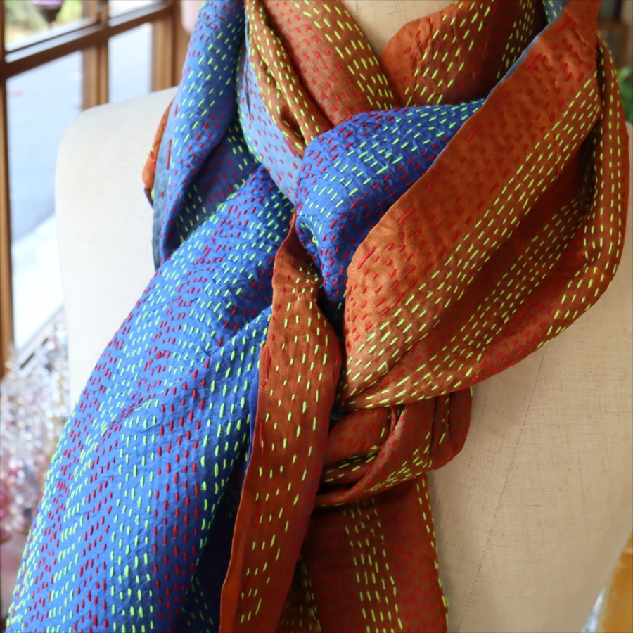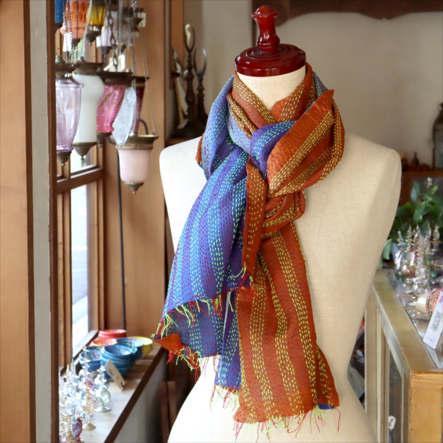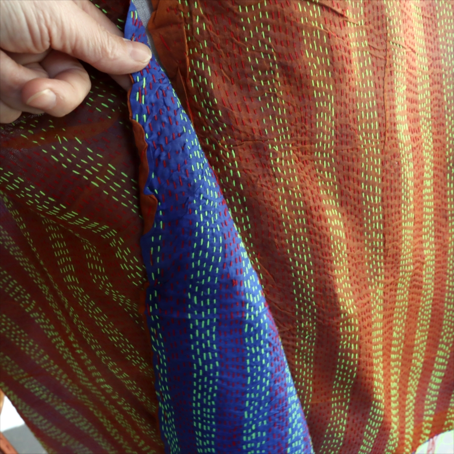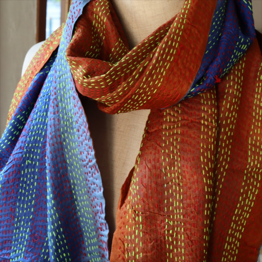 カンタ刺繍のシルクストールです。シルクの光沢感、布地の色柄とビビットな刺繍が個性的な布。ベースのシルク地はサリー(女性の衣装)のリサイクルで、表と裏に違う色柄の布を合わせて手作業で縫い合わされています。表裏ともにシルクなので軽くてさらりとした肌触りです。