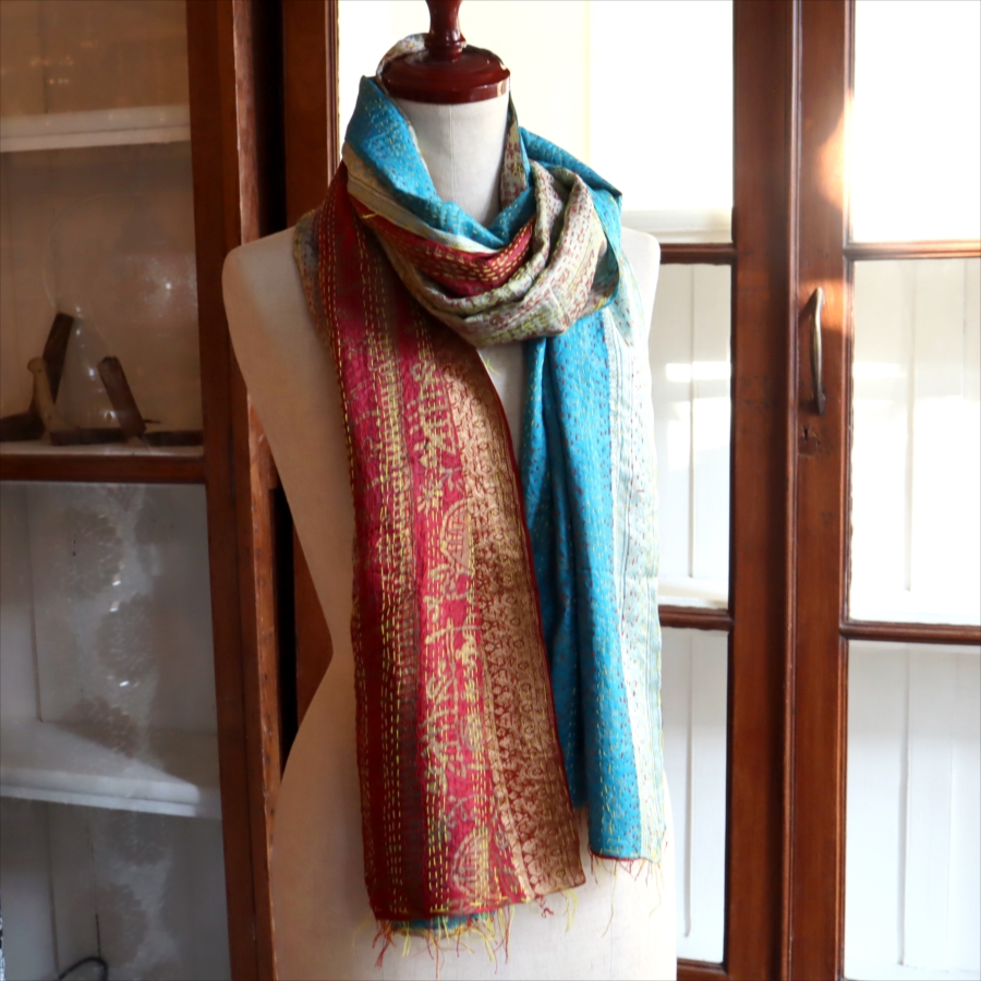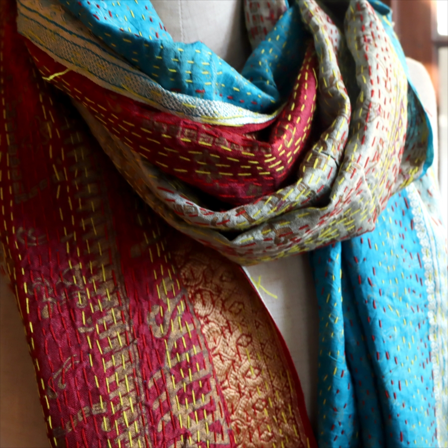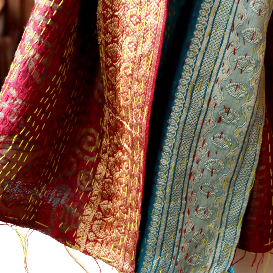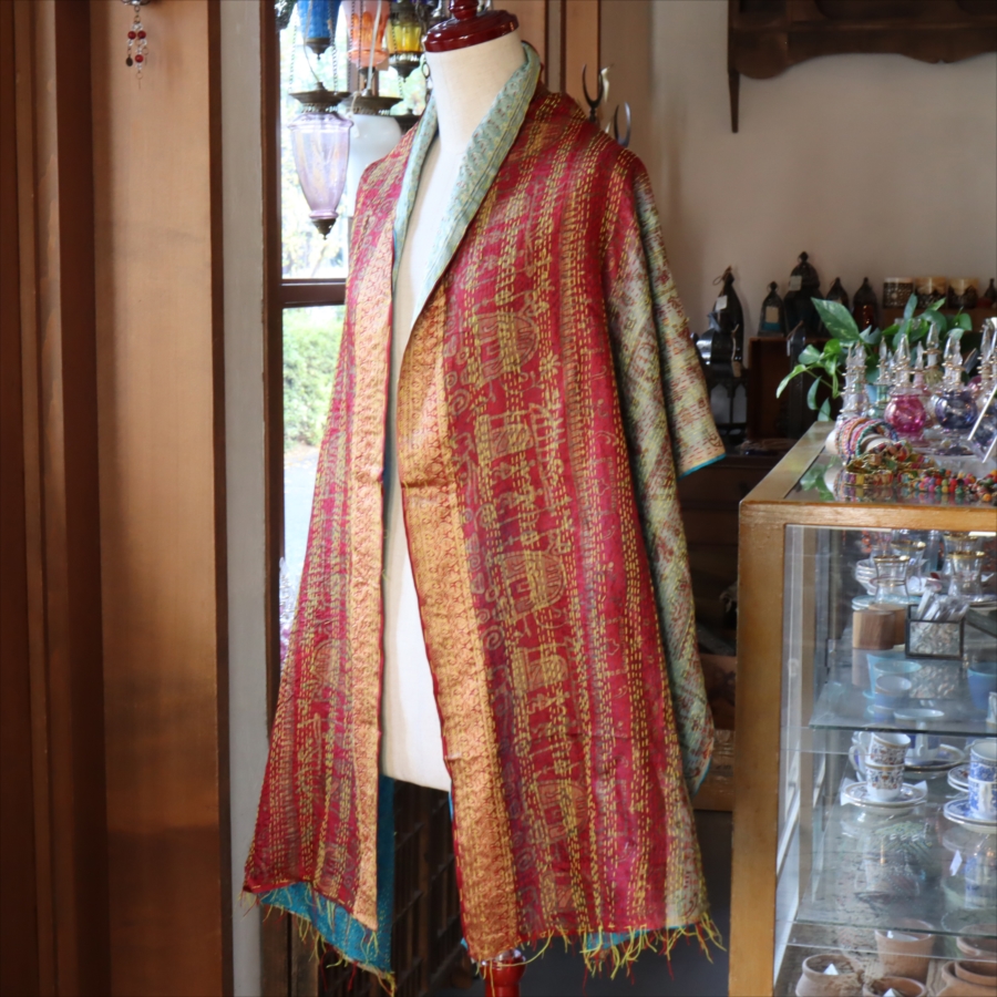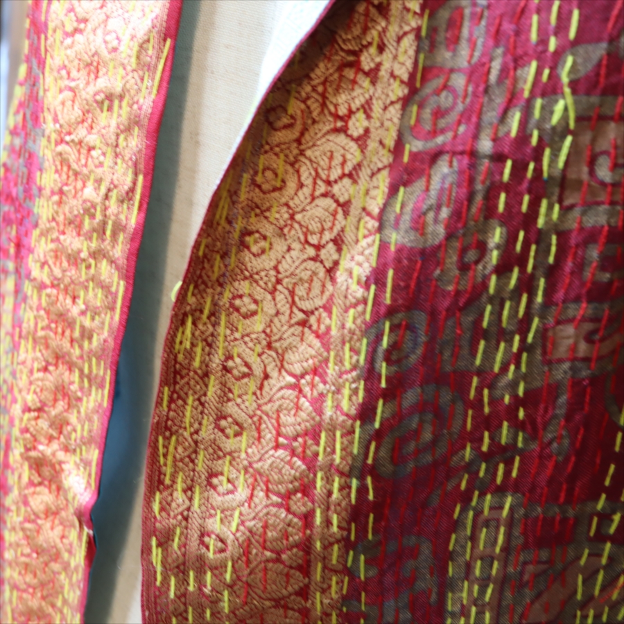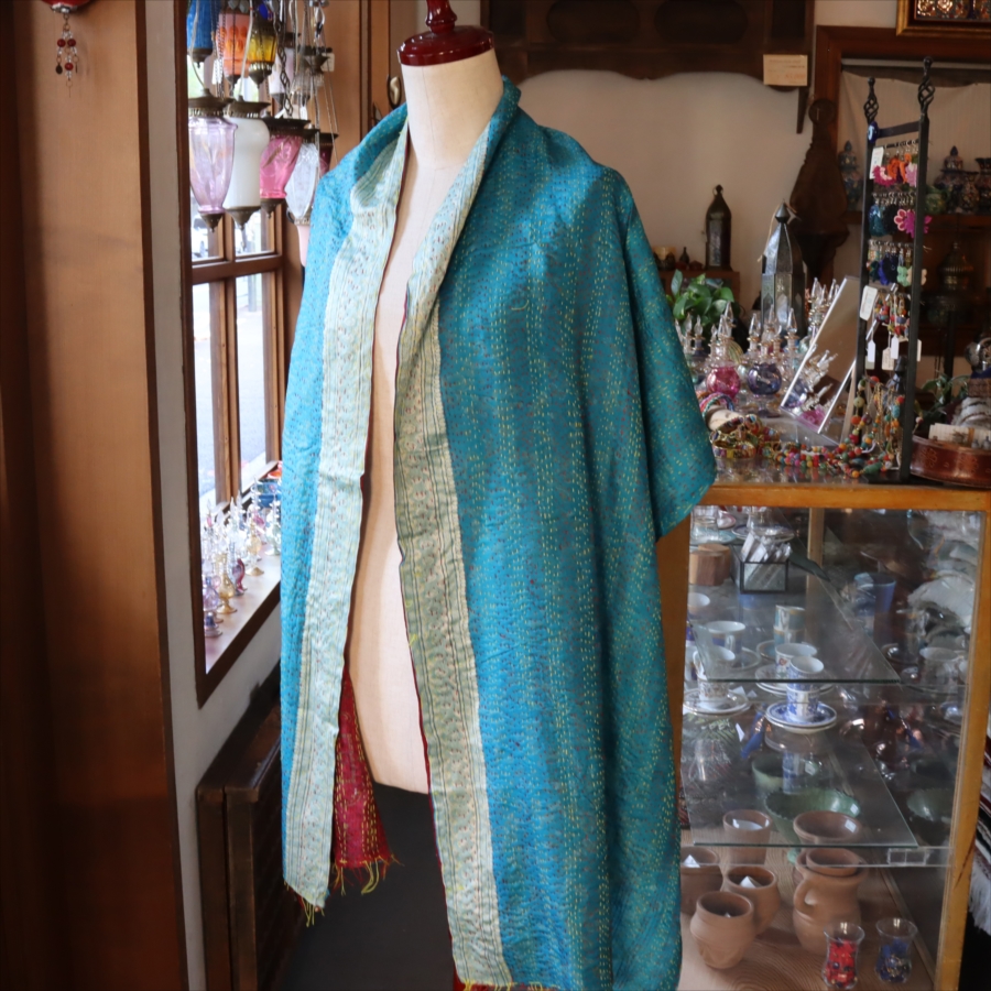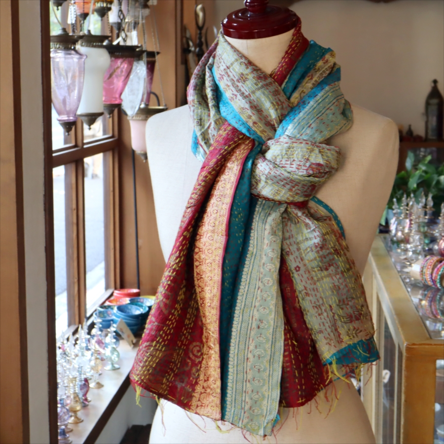 カンタ刺繍のシルクストールです。シルクの光沢感、布地の色柄とビビットな刺繍が個性的な布。ベースのシルク地はサリー(女性の衣装)のリサイクルで、表と裏に違う色柄の布を合わせて手作業で縫い合わされています。表裏ともにシルクなので軽くてさらりとした肌触りです。