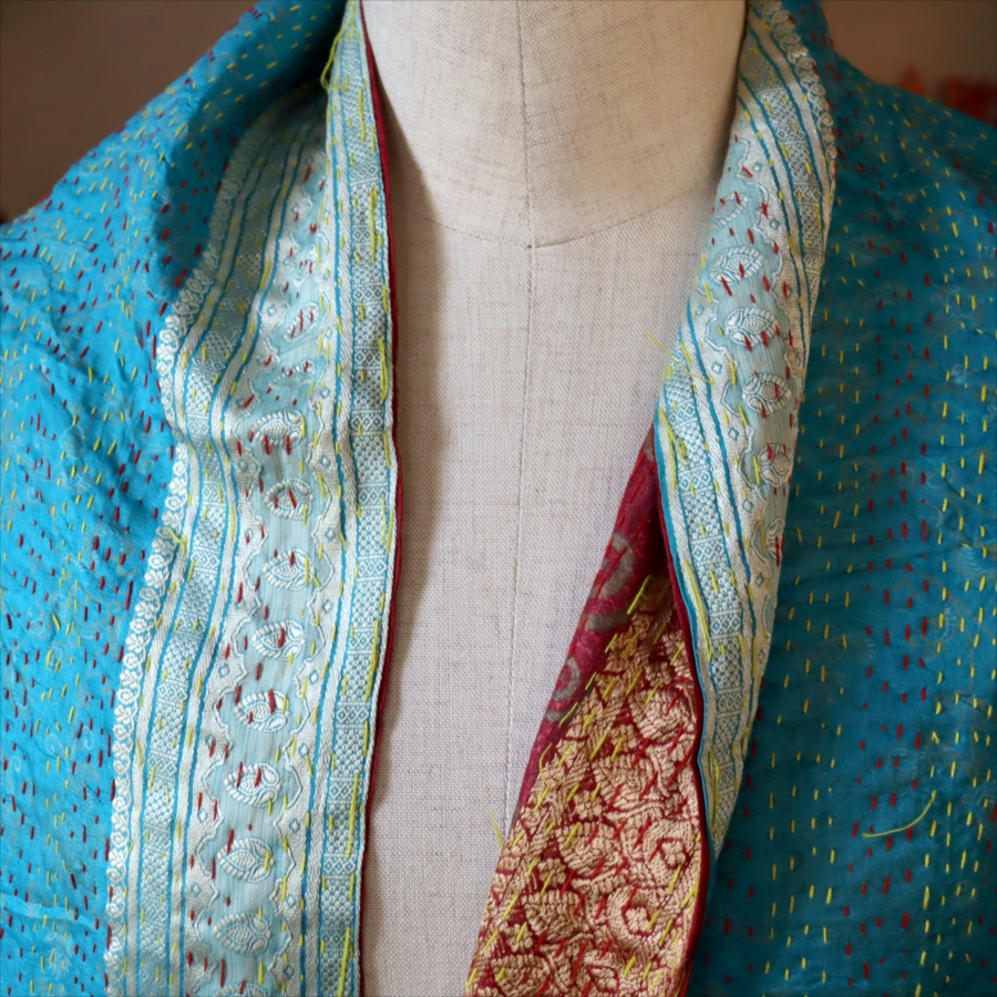 使われているサリーは20世紀後期のベンガル地方のものとされ、刺繍布も同じくベンガル地方で現在つくられています。