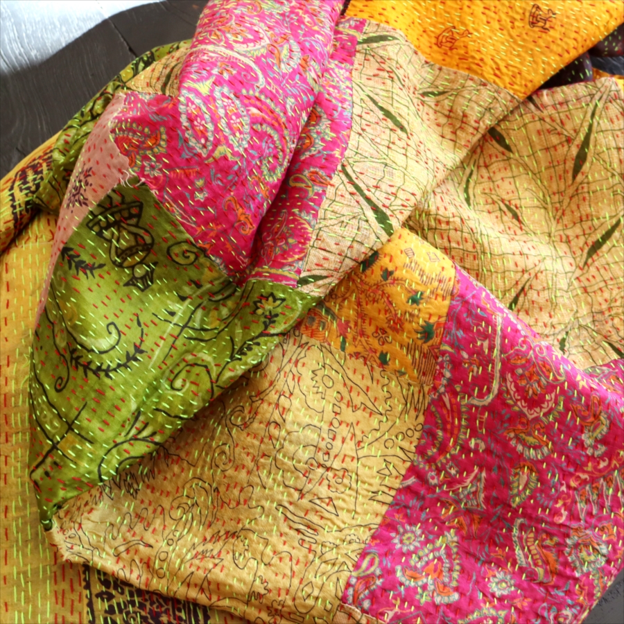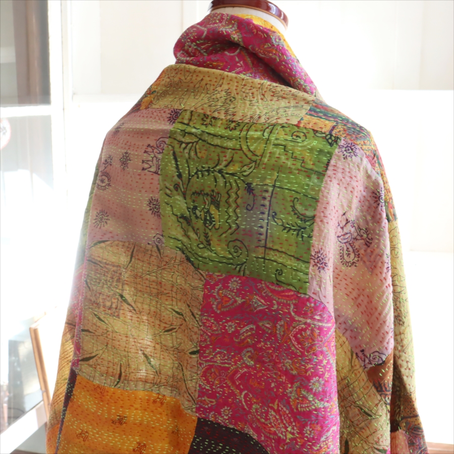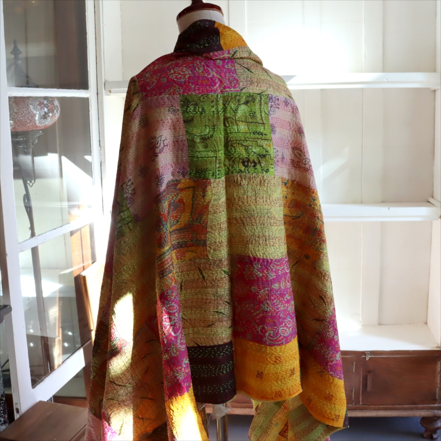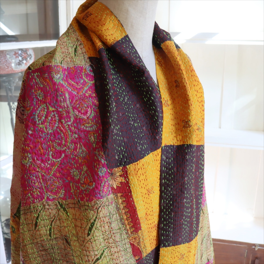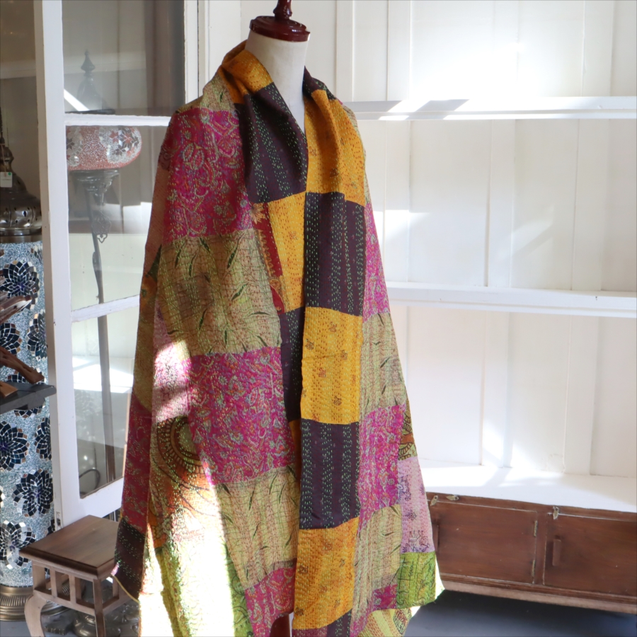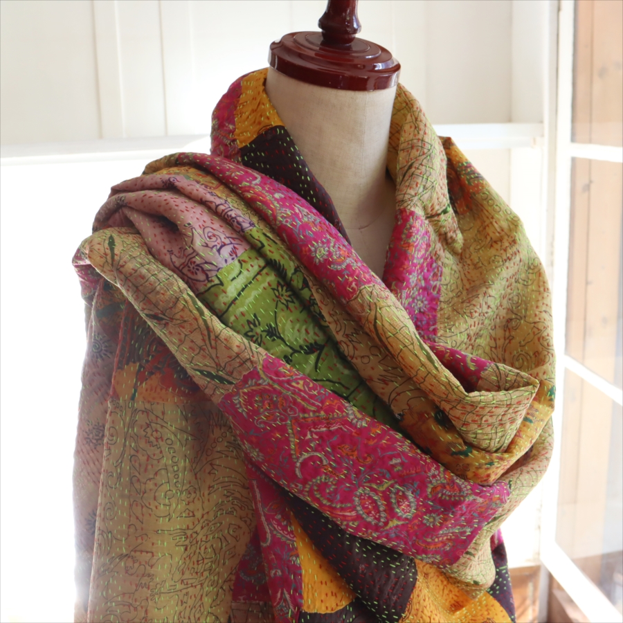 使われているサリーは20世紀後期のベンガル地方のものとされ、刺繍布も同じくベンガル地方で現在つくられています。大判サイズで、ストールとしてはかなりのボリュームがあります。ひざ掛けにしたり、インテリアファブリックとしてソファースローやカーテンのような使い方にもおすすめです。