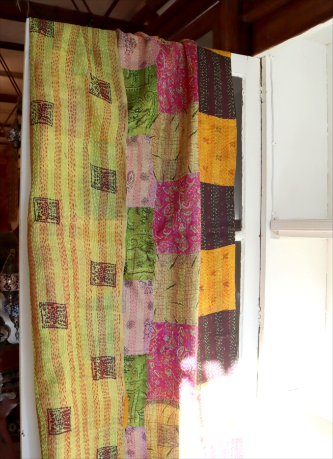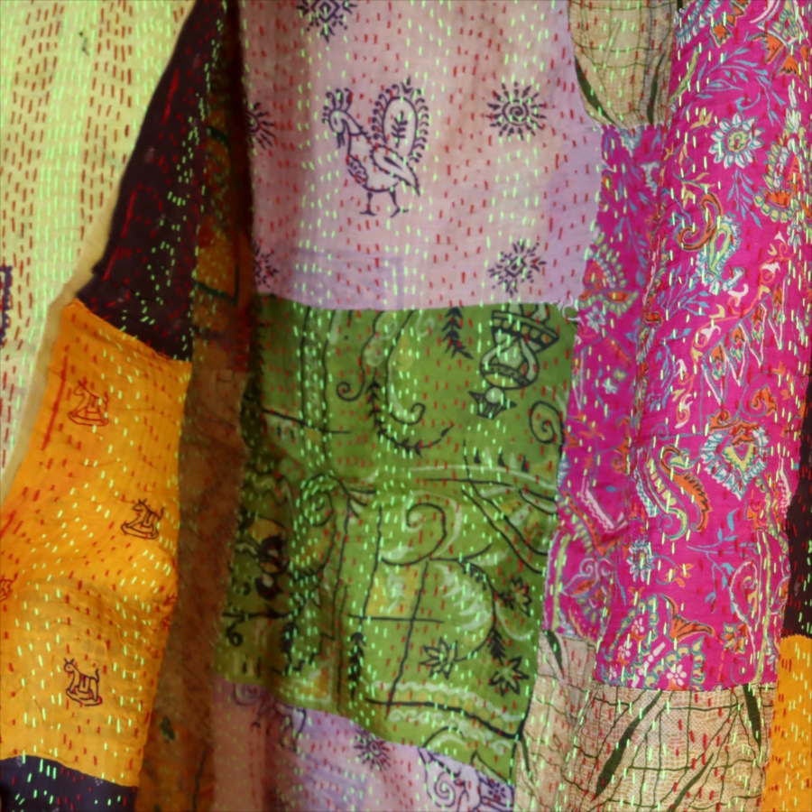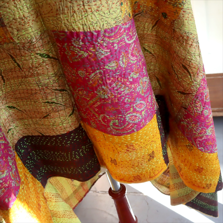 カンタ刺繍のシルクストールです。表面は20cm程度にカットされた布を手作業でつなぎ合わせたパッチワーク、裏面はシンプルな色が貼り合わせてあります。ベースのシルク地はサリー(女性の衣装)のリサイクルです。