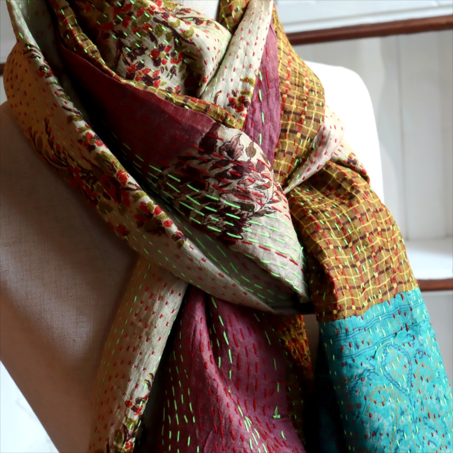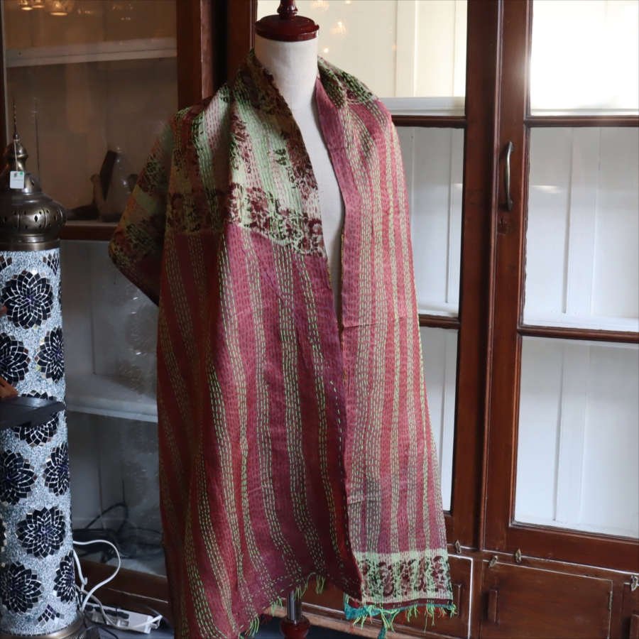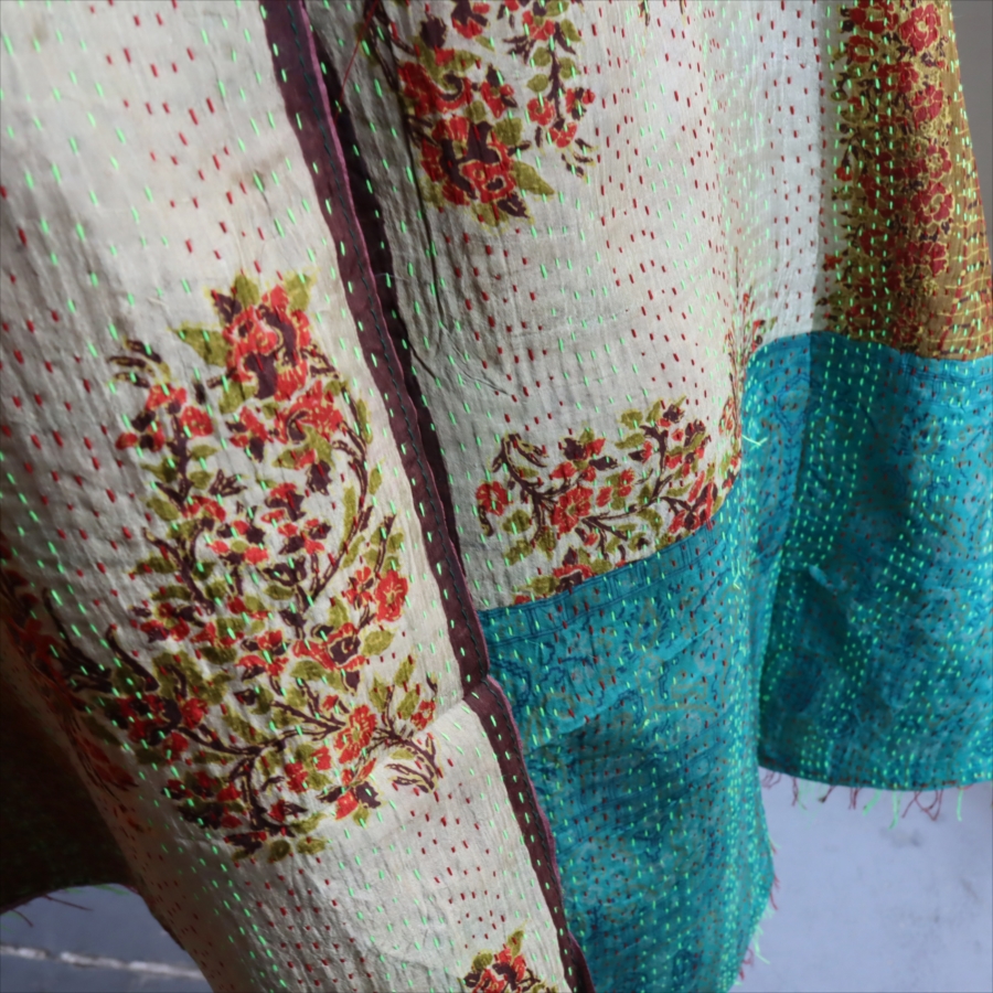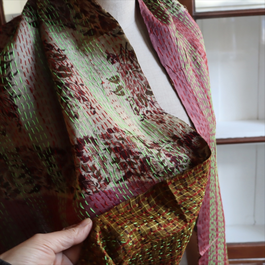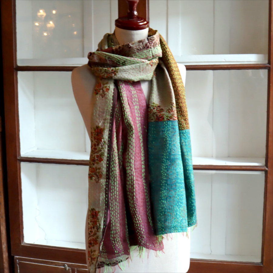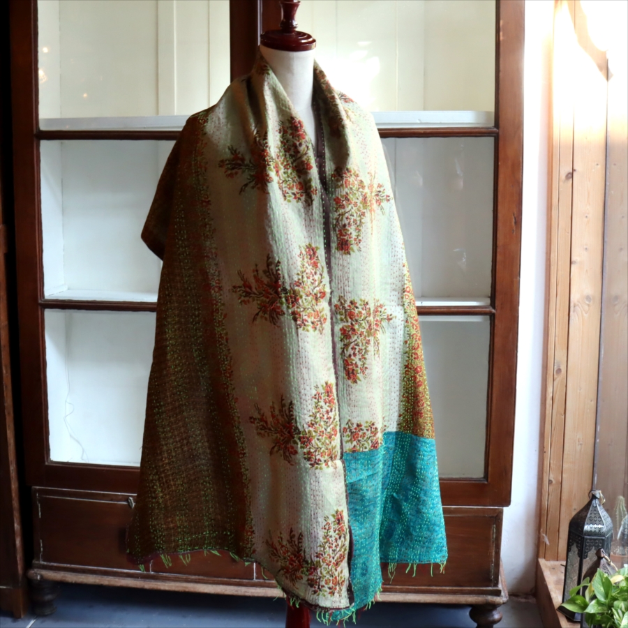 カンタ刺繍のシルクストールです。シルクの光沢感、布地の色柄とビビットな刺繍が個性的な布。ベースのシルク地はサリー(女性の衣装)のリサイクルで、表と裏に違う色柄の布を合わせて手作業で縫い合わされています。表裏ともにシルクなので軽くてさらりとした肌触りです。